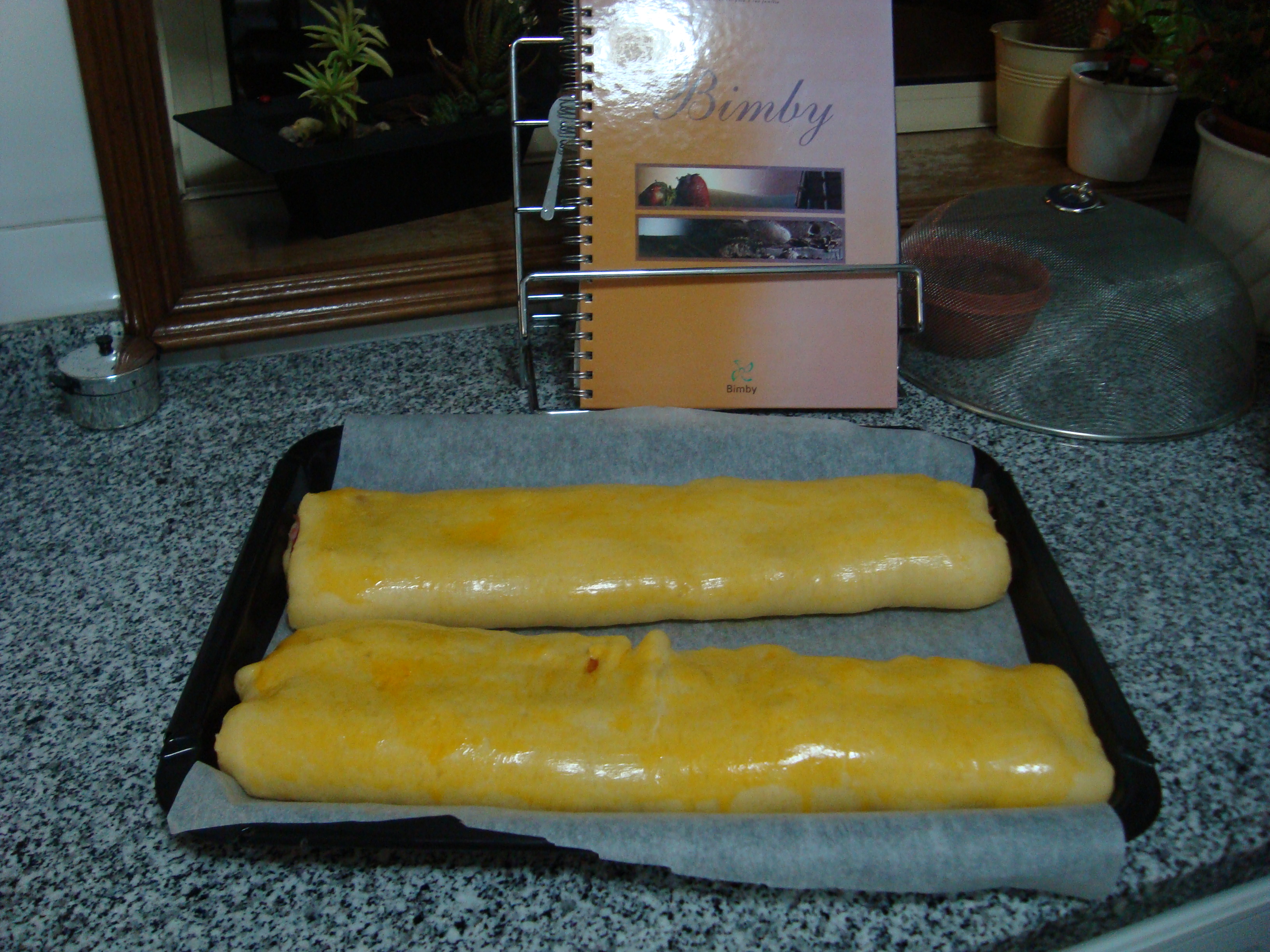 5 - Quando já tiver dobrado o volume, estique a massa com um rolo em dois retangulos e no meio de cada um deles, coloque as carnes que desejar (Chourição; Paio York; Fiambre etc), dobre uma parte do retangulo por cima das carnes e volte a repetir o processo das carnes, tape com a outra parte do retangulo, pincele com ovo e deixe levedar novamente. Leve ao forno previamente aquecido a 180º até ficar cozinhada.