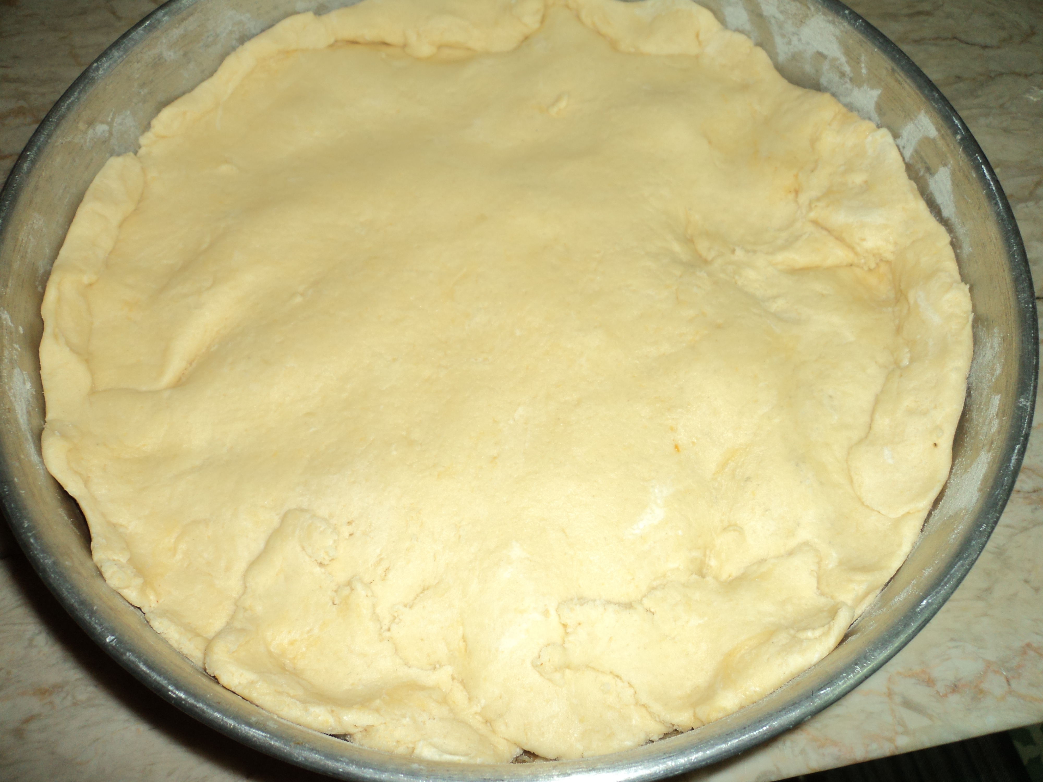 "Tampa fechada" programe 15 seg. vel.6.Divida a massa em duas parte, coloque metade da massa em uma forma untada com margarina e trigo e espalhe com a mão, ou utilize o rolo da massa, coloque o recheio a gosto e cubra com o restante da massa.