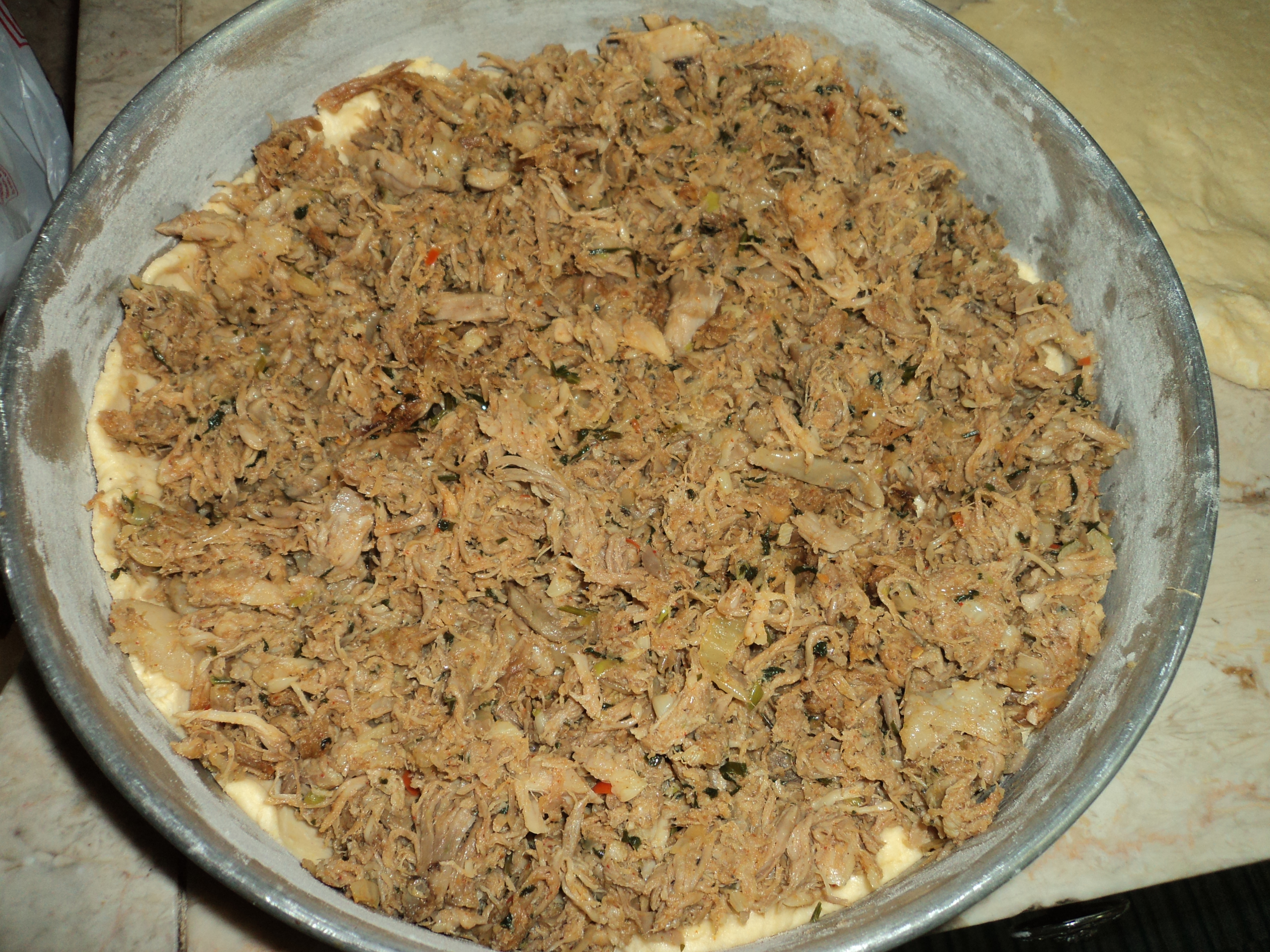 Opcão de recheio: O meu foi recheado com frango cozido e desfiado.