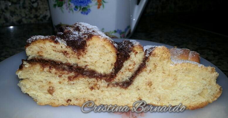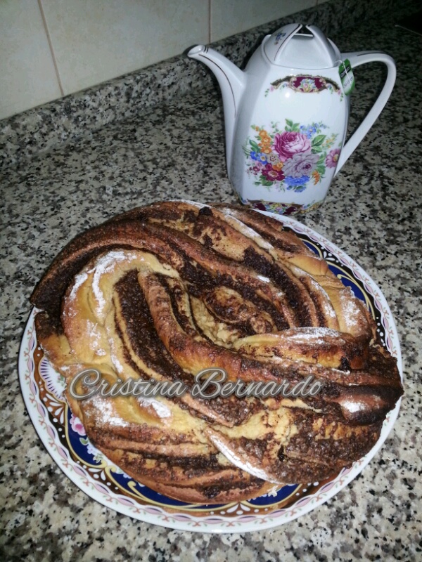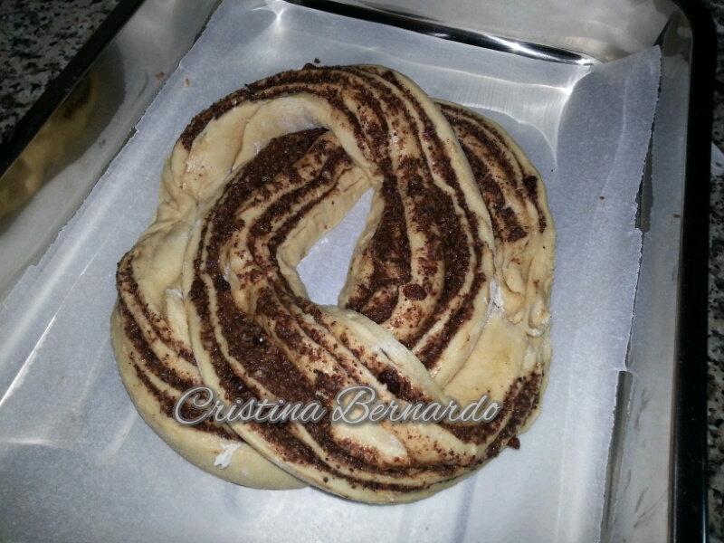 4. Num tabuleiro colocar papel vegetal. Entrançar as duas partes e formar uma coroa. Polvilhar com açúcar em pó.