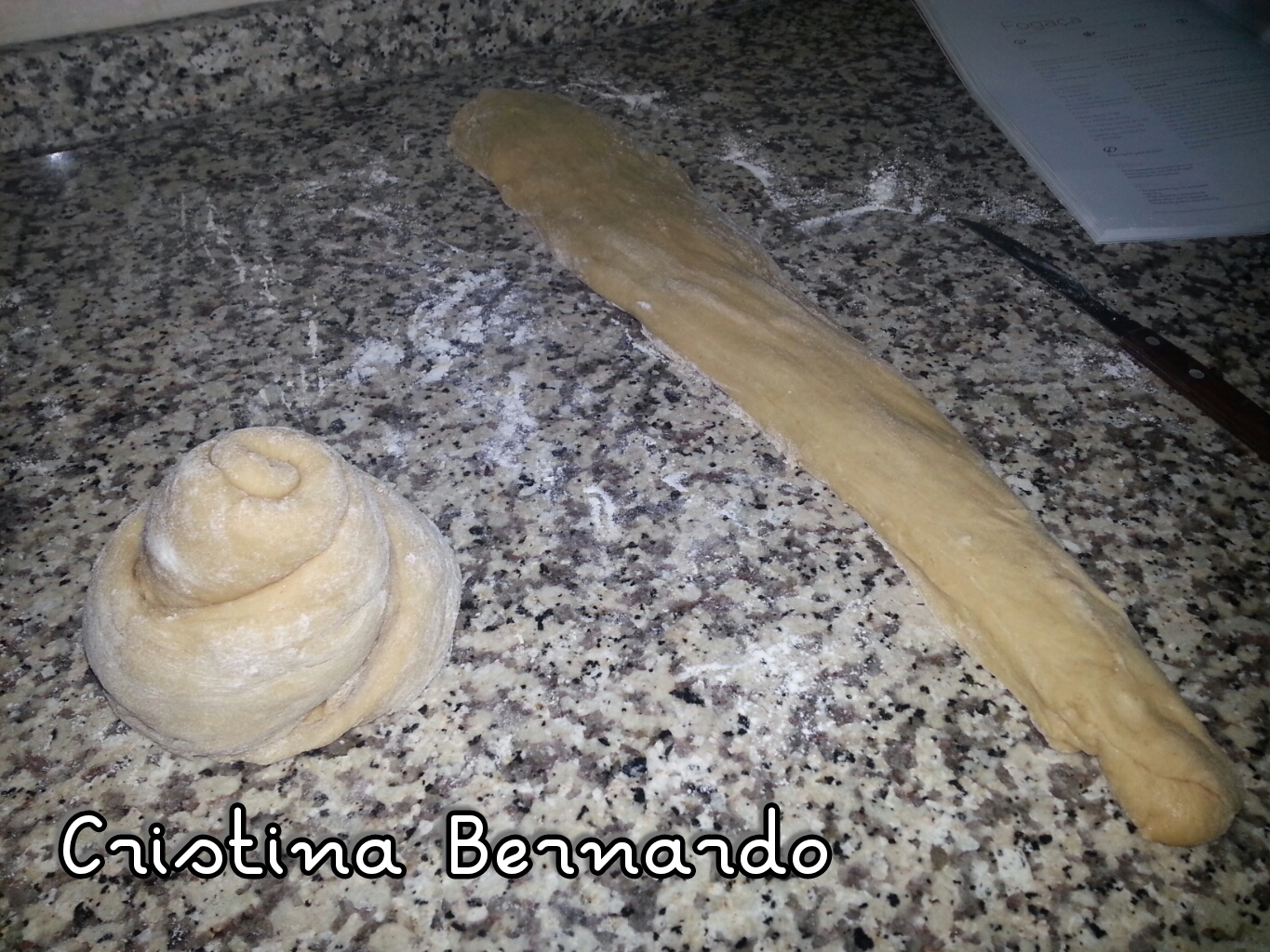 "Tampa fechada" . Retirar, polvilhar com farinha e deixar levedar até dobrar de volume.4. Dividir a massa ao meio. Moldar um rolo ligeiramente achatado até meio e enrole-o em forma de uma