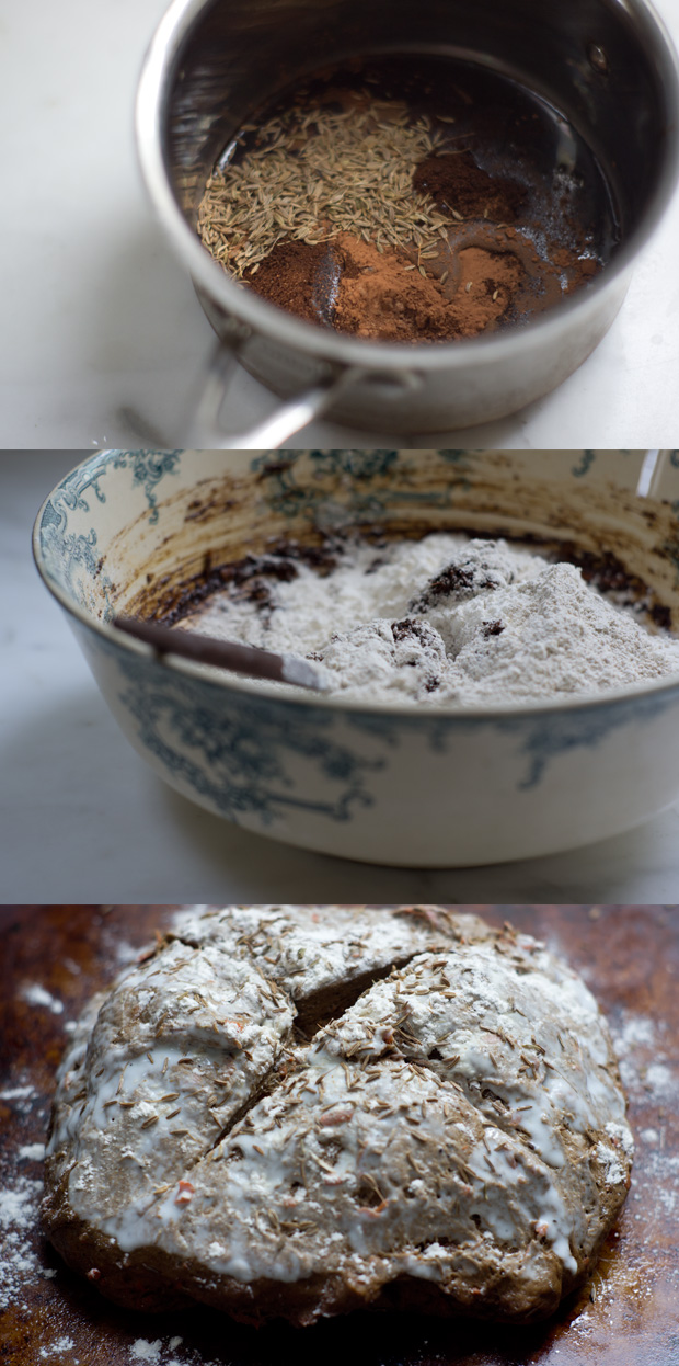 Retire a película, pincele com o buttermilk, polvilhe com um pouco de farinha, 1 c.chá de sementes e coentros e, com uma faca afiada e de serrilha, forme uma cruz até cerca de 1/4 de profundidade (faça os possíveis para não desmanchar o formato). Leve ao forno a 220º cerca de 20 mnt. Reduza para 180º e deixe cozer mais 20-25 mnts, ou até o paõ formar uma crosta estaladiça ou quando bater no topo este lhe pareça oco. Retire do forno e deixe arrefecer cerca de 15 mnts numa rede antes de o fatiar.Dicas: Poderá colocar a massa a levedar no topo do forno quando este estiver ligado, resulta comigo, caso contrário um sítio solarengo também funciona muito bem por exemplo. Esta receita pede cenouras, o que dá umas mechas bonitas de côr á massa, mas alternadamente poderá fazer outra versão usando batata. Usei melaço nesta receita mas poderá substituir com mel, esta opção resulta numa massa mais leve.