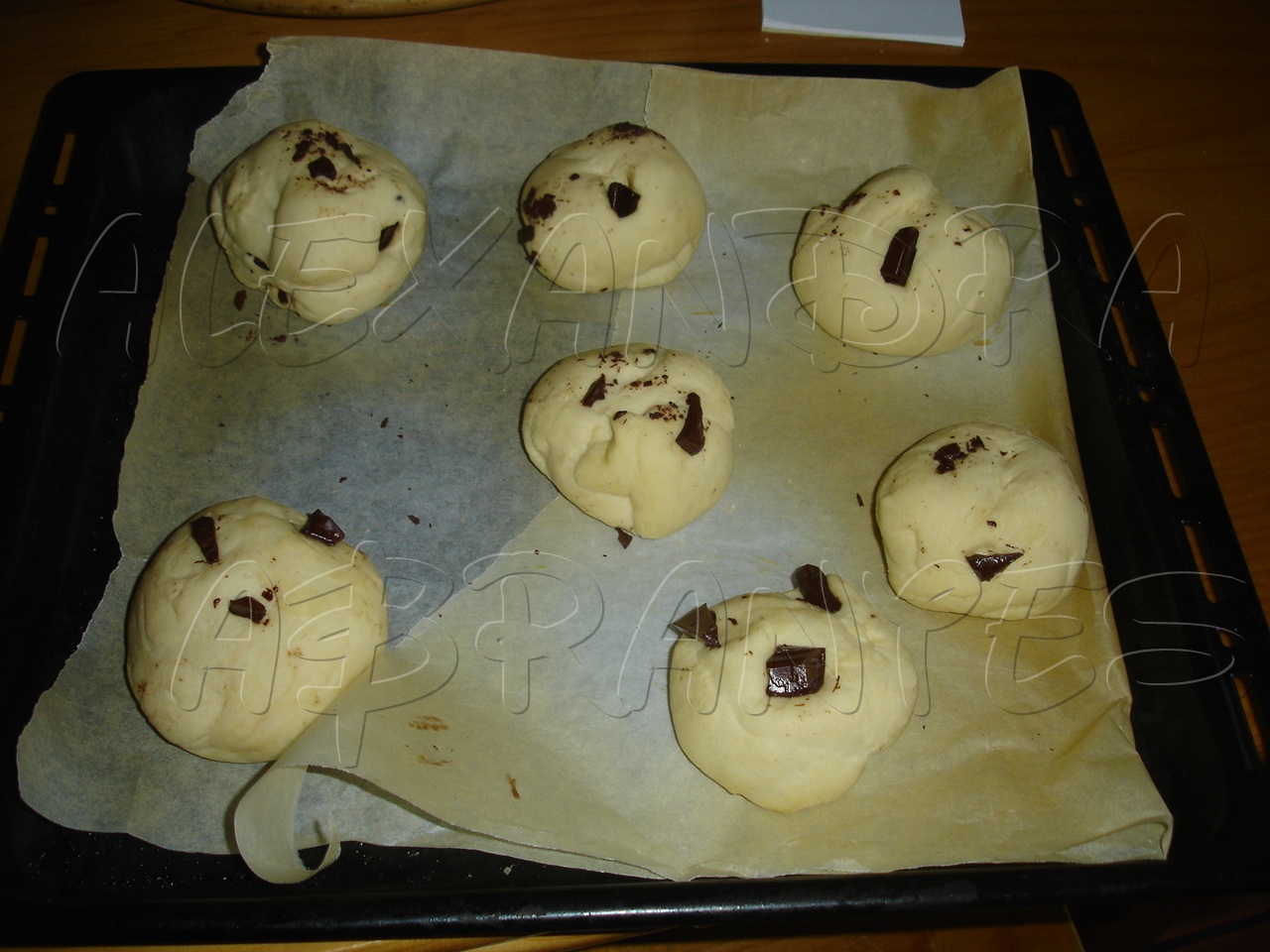 Após este tempo divida a massa em 12 porções iguais (mais ou menos 70 gramas cada) e adicione a cada uma pedaços de chocolate a gosto e forme bolas. Coloque-as num tabuleiro forrado com papel vegetal e deixe levedar durante 30 minutos.