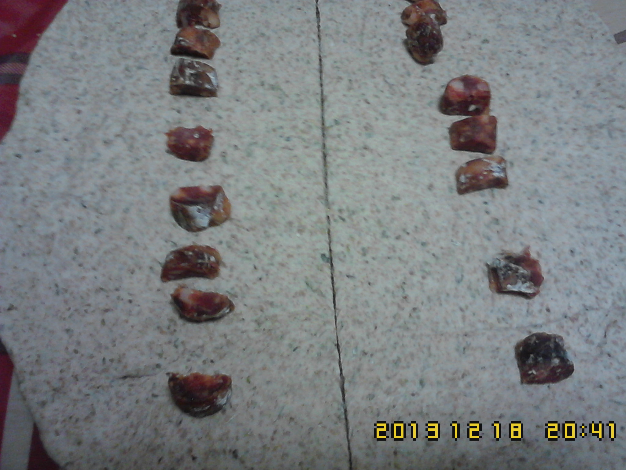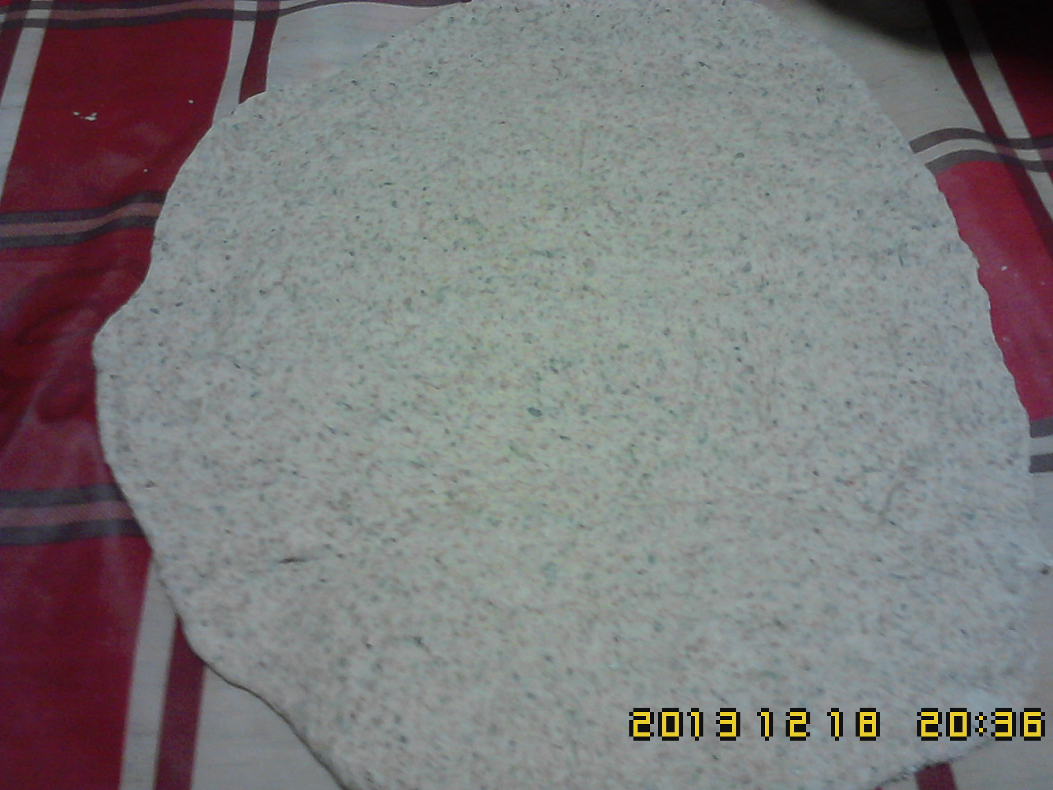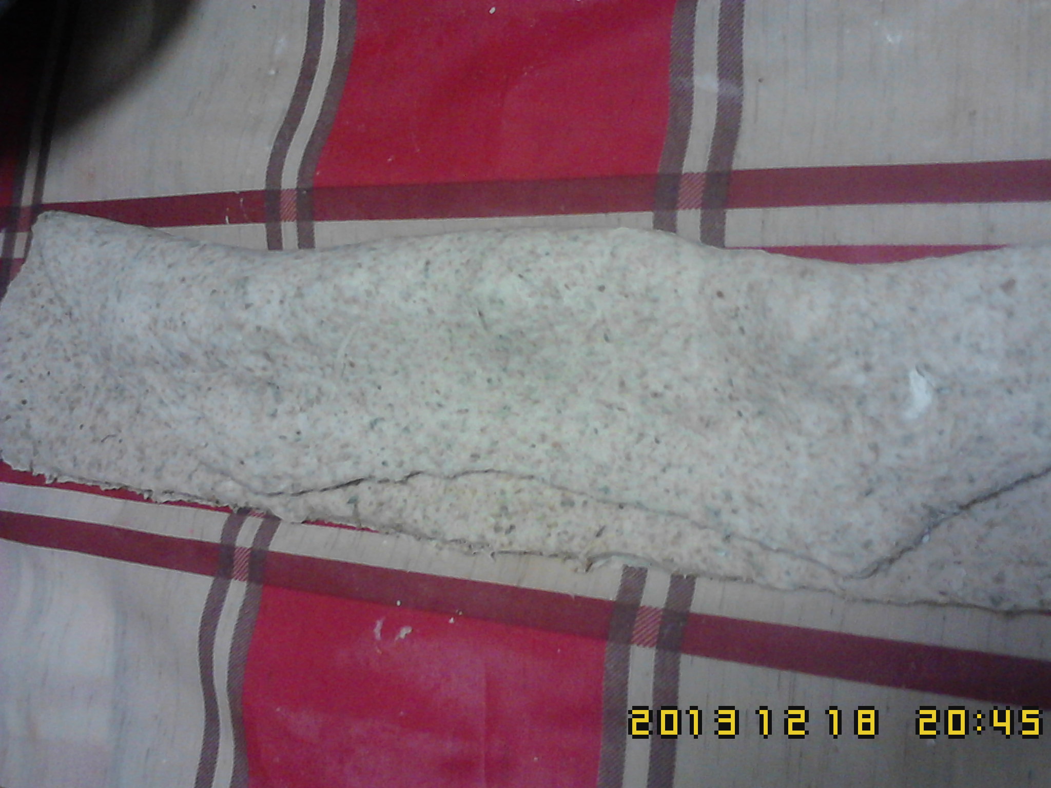 "Espiga" .3)Faça uma bola,depois com o rolo da massa,estenda na mesa,pode dividir em 8 ou 4.Ponhas as rodelas de chouriço e faça os trvesseiros.