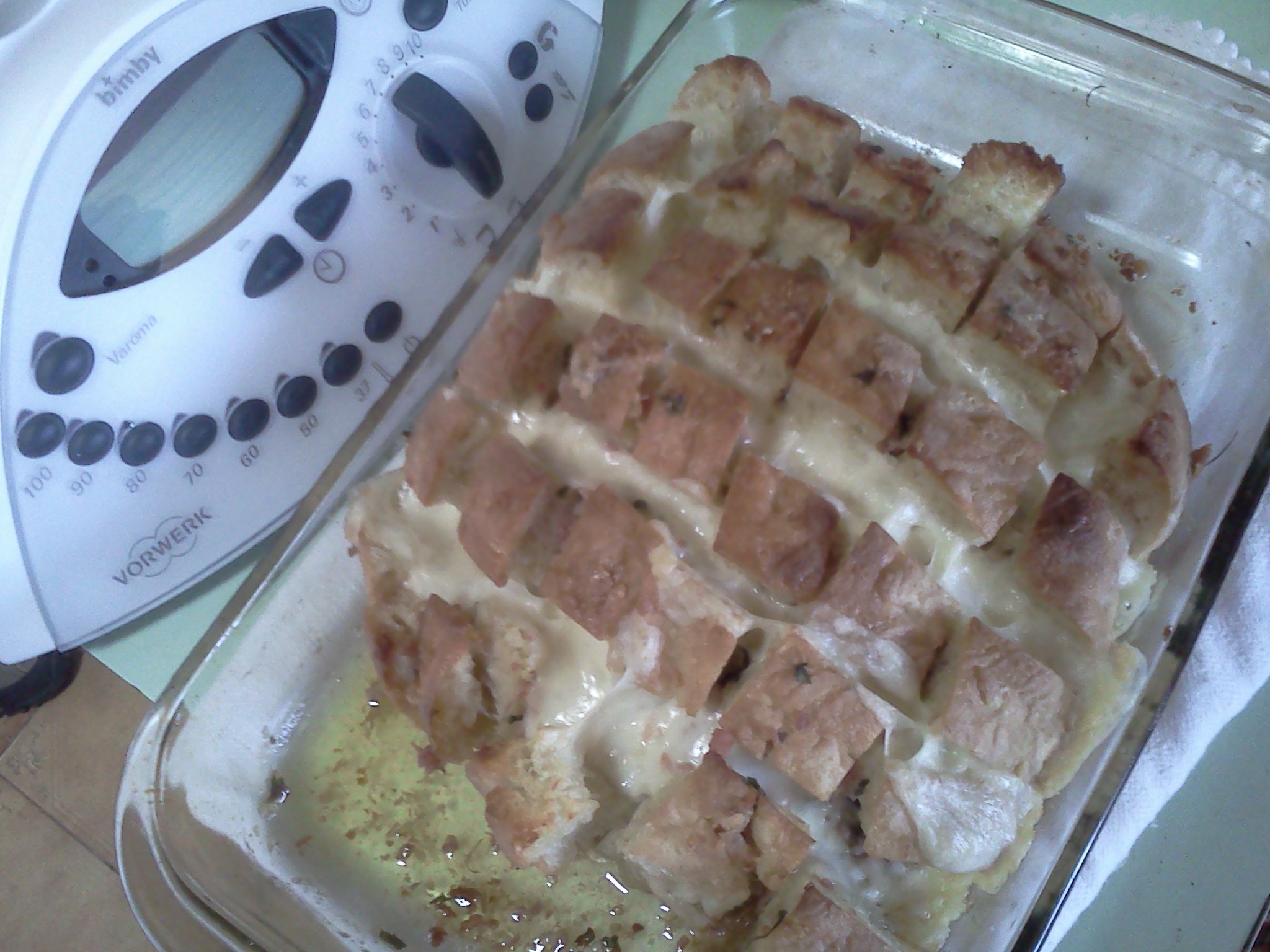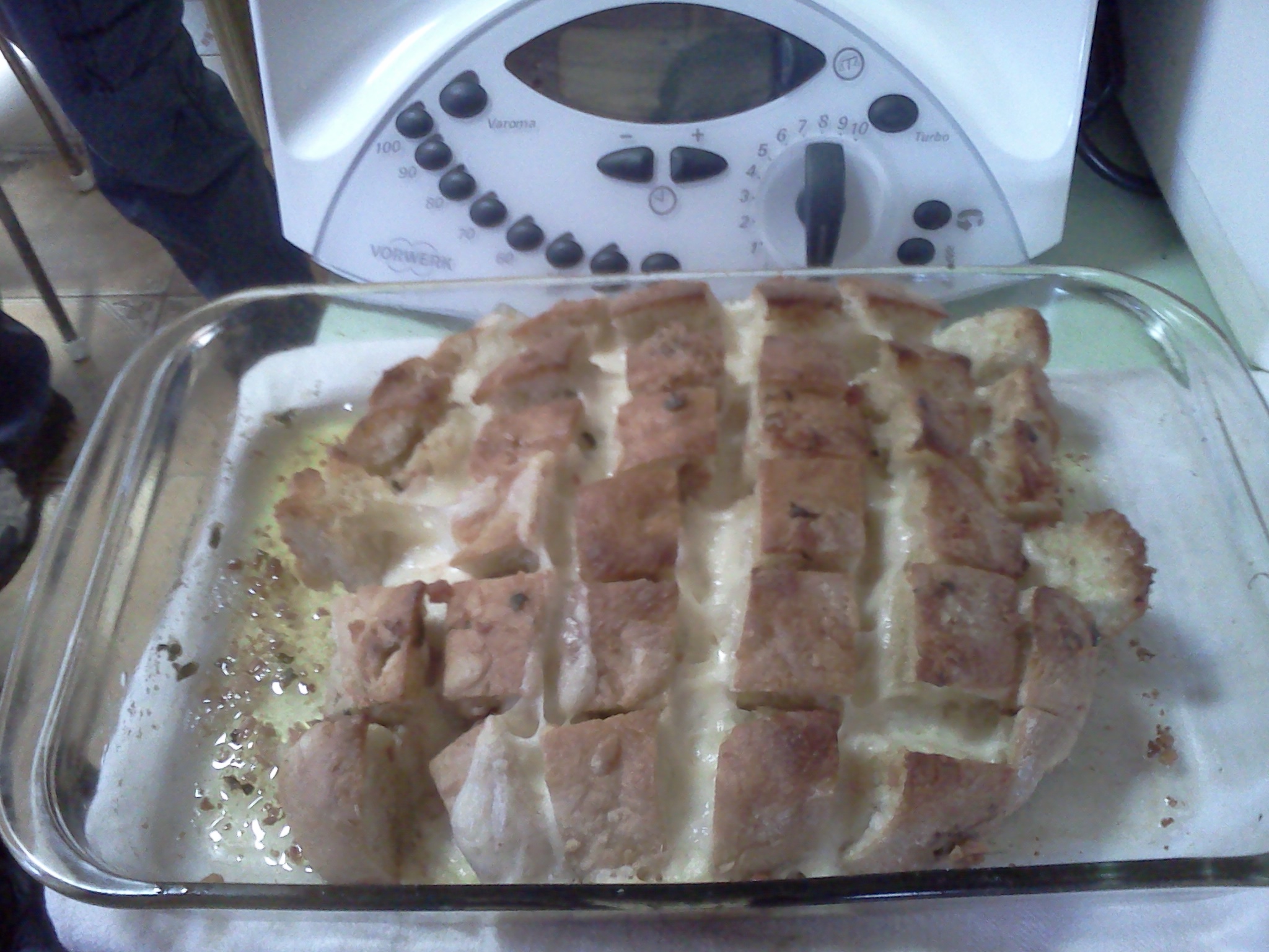 Cortar o pão até ao fundo em quadradinhos sem cortar a crosta inferior, regar com o preparado em colocar fatias de queijo nos entrevalos.