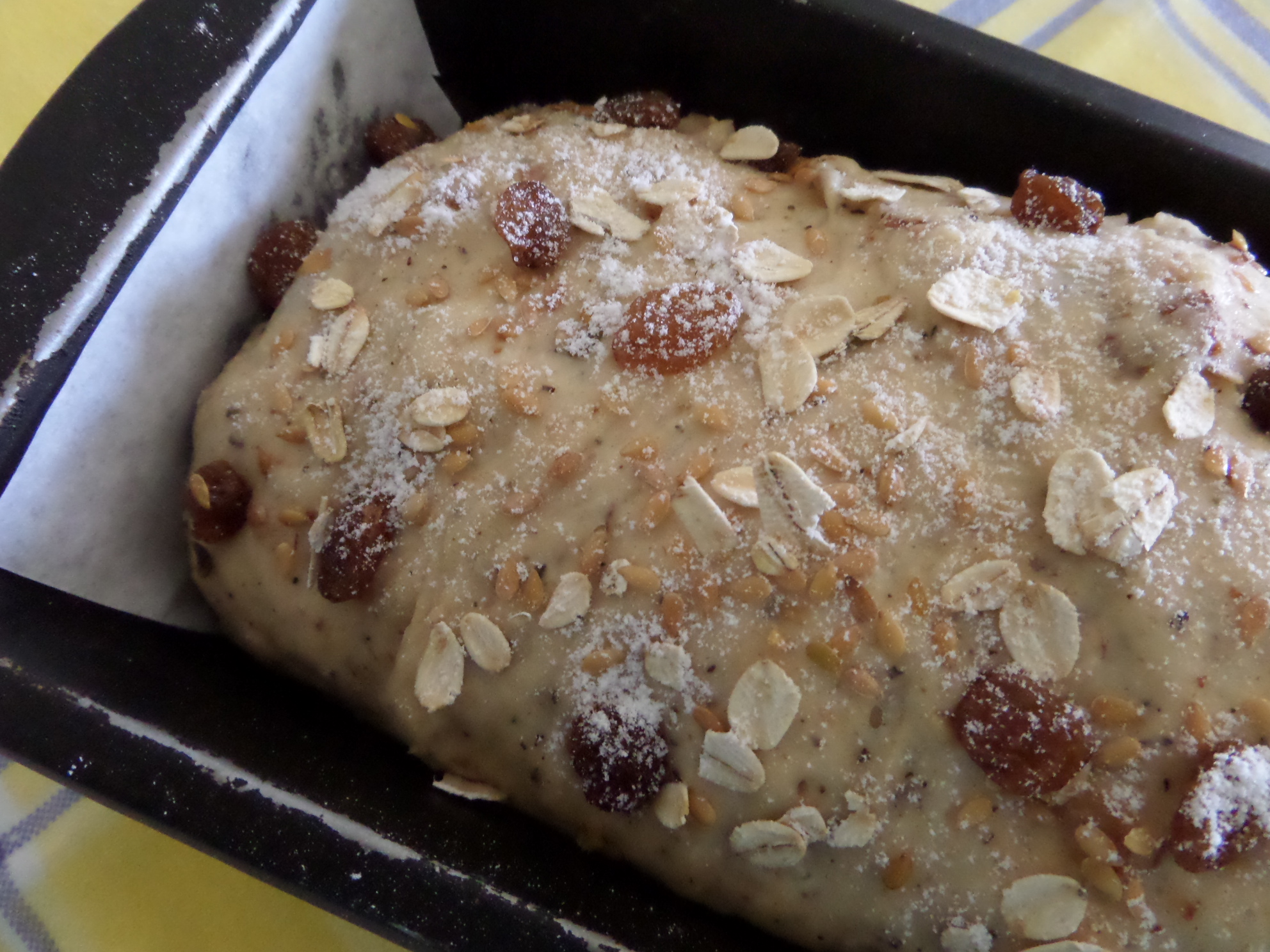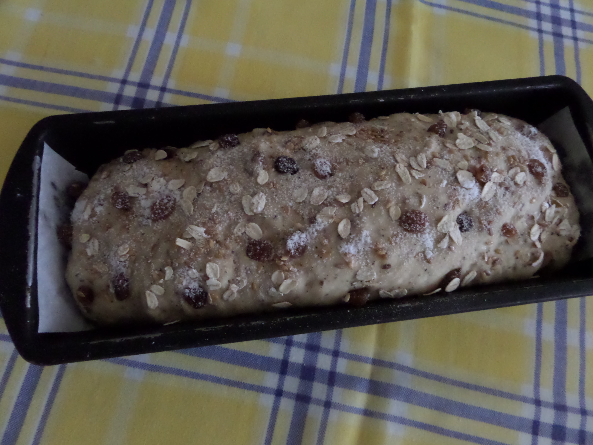 "Tampa fechada" e deixe levedar em local quente cerca de 2 horas.Transfira a massa para a bancada enfarinhada e amasse mais um pouco, molde um rolo e coloque numa forma de bolo inglês forrada com uma tira de papel vegetal. Tape e deixe levedar novamente em local quente cerca de 40 min.Findo o tempo pincele a massa com um pouco de água e polvilhe com o açúcar, as passas, as sementes de linhaça e os flocos de aveia.Leve a cozer ao forno pré-aquecido a 180º durante 25 a 30 min. (faça o teste do palito). Deixe arrefecer e sirva em fatias barradas com manteiga, compota...como mais gostar!!Nota: quanto mais tempo a massa levedar mais fofa ficará, por isso é sempre bom deixar a massa levedar sempre mais de uma hora, uma hora e meia.