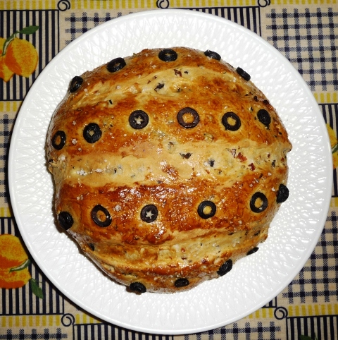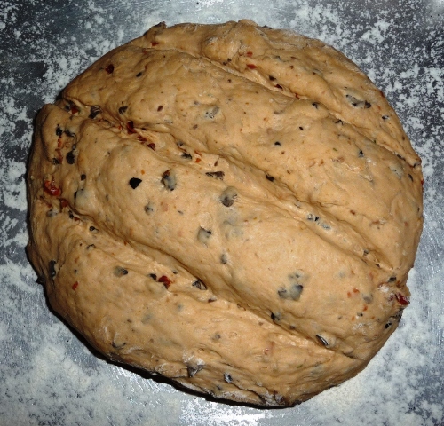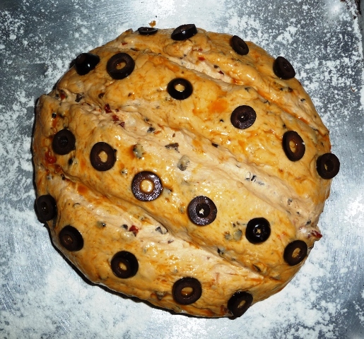 De seguida junta-se a farinha e o sal e programa-se 10 seg vel 6. finalmente junta-se as azeitonas (reservando algumas rodelas para pôr por cima do pao ) e o tomate e programa-se 2 minutos