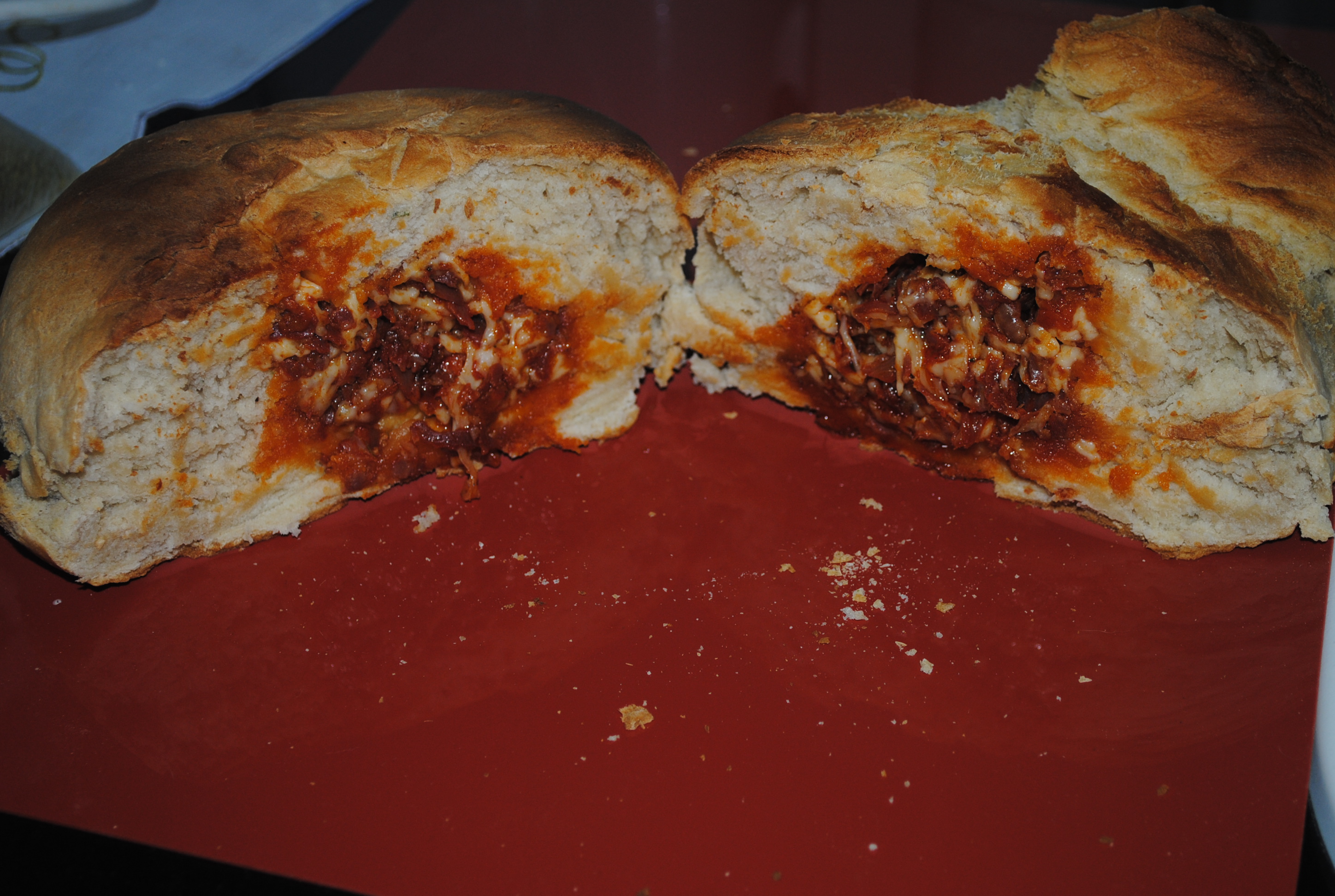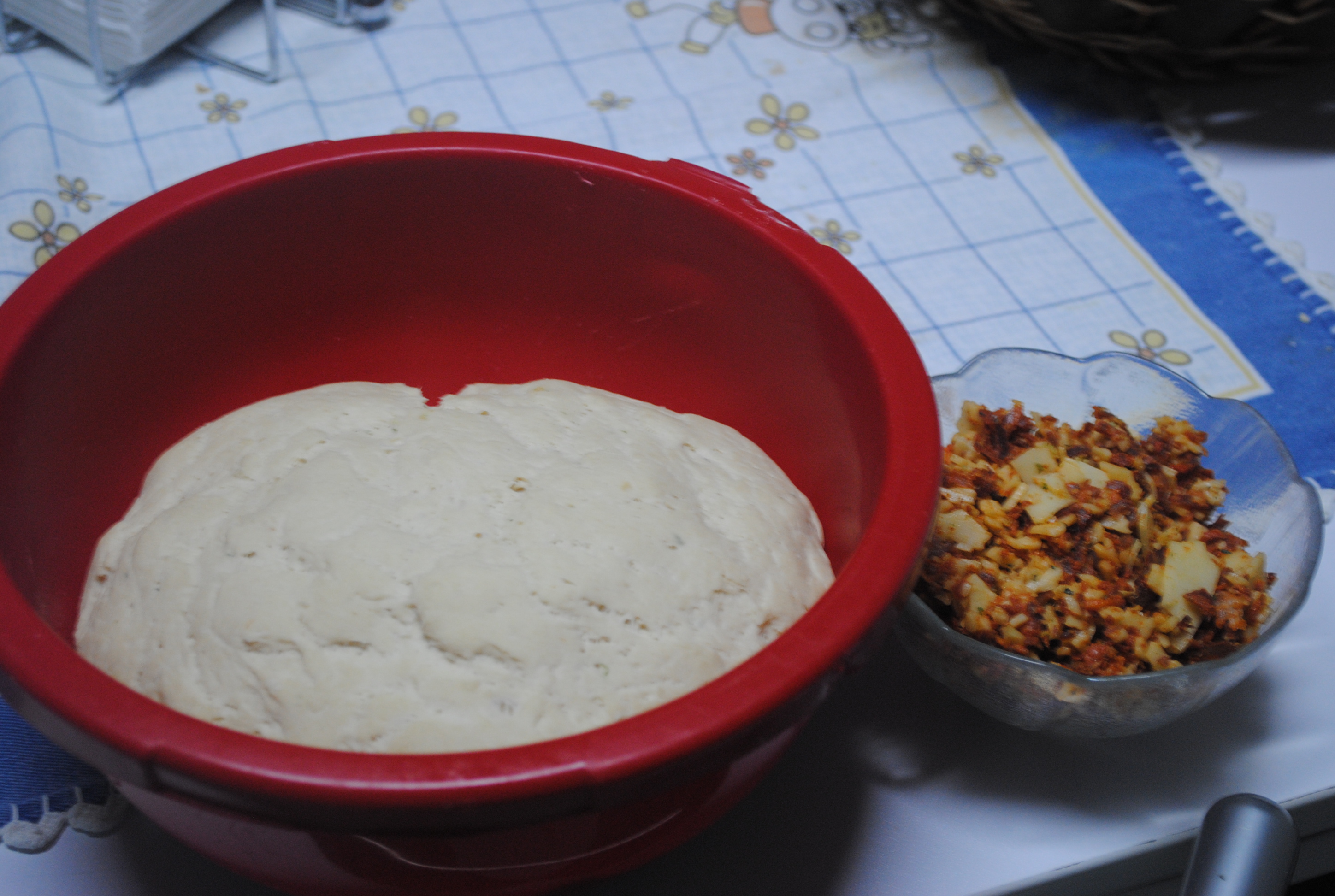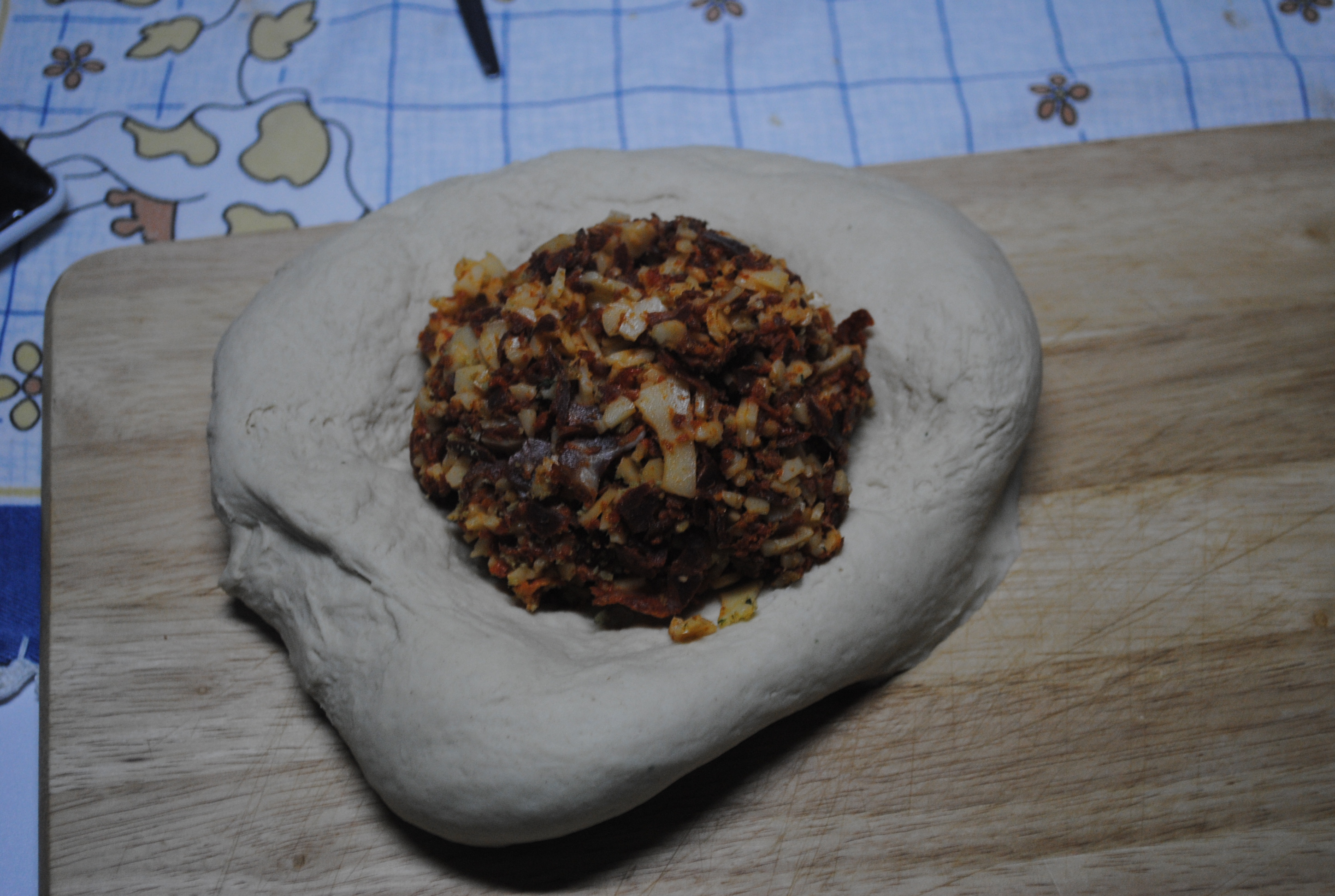 Colocar o picado do paio com o queijo, fechar a massa e dar a forma ao pão.