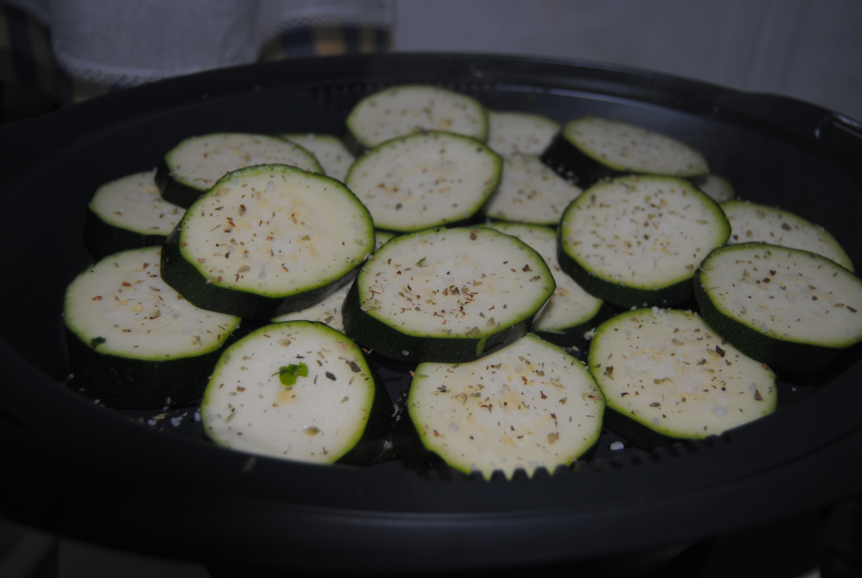 Colocar a outra travessa da varoma com a courgette salpicada com sal e polvilhada com oregãos.