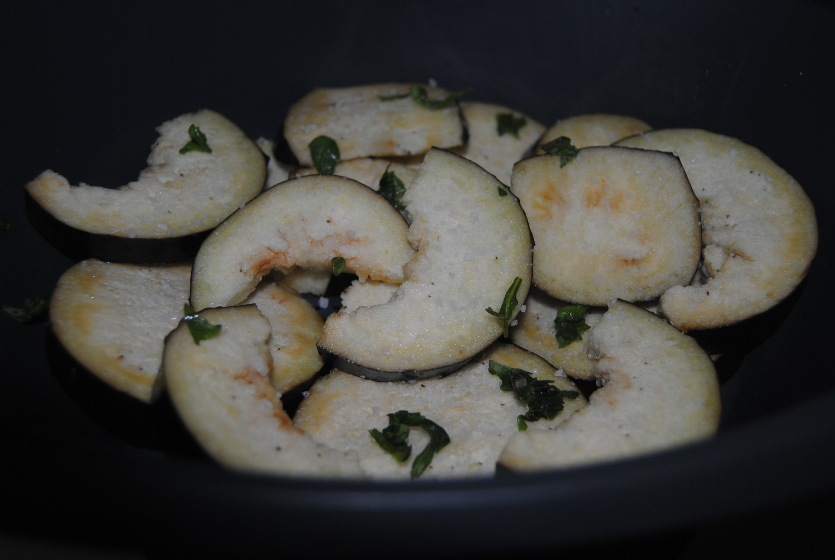 Colocar a beringela na 1.ª travessa da varoma salpicada com sal e espalhar por cima o majericão picado.