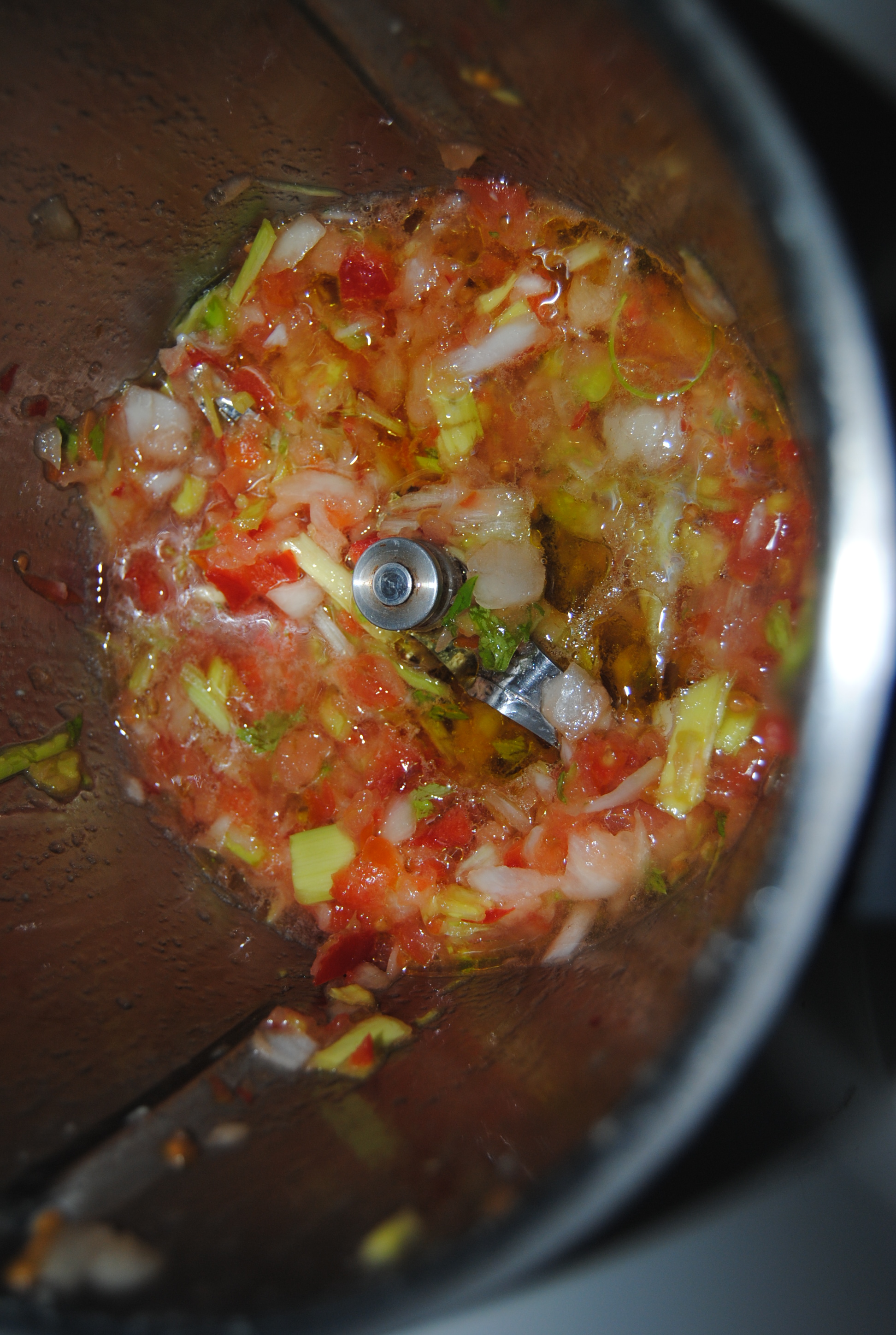 Colocar os legumes no copo e durante 10 s aumentar gradualmente a velocidade até 5 de modo a que estes fiquem picados.