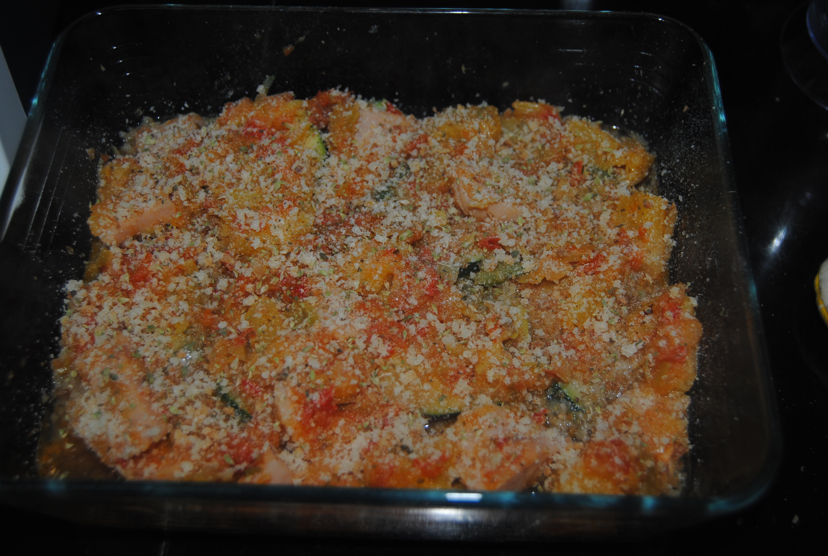 Polvilhar com pão ralado ( aproveitei para ralar resto de pão que tinha feito na Bimby), e com o queijo ralado e levar uns minutos ao forno a gratinar.