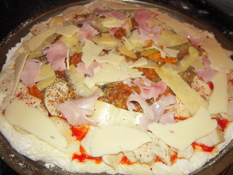 Na pizza circular ainda salpiquei com umas fatias de fiambre e de queijo flamengo para a minha criança não torcer muito o nariz...