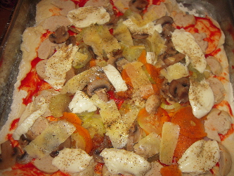 Espalhei com ajuda de uma colher a polpa de tomate por cima das massas e coloquei as rodelas de legumes, depois os cogumelos, a salsicha às rodelas e espalhei a farinheira. Depois coloquei as fatias de queijo mozzarella e as lascas de queijo da ilha e temperei com os temperos em cima descritos.