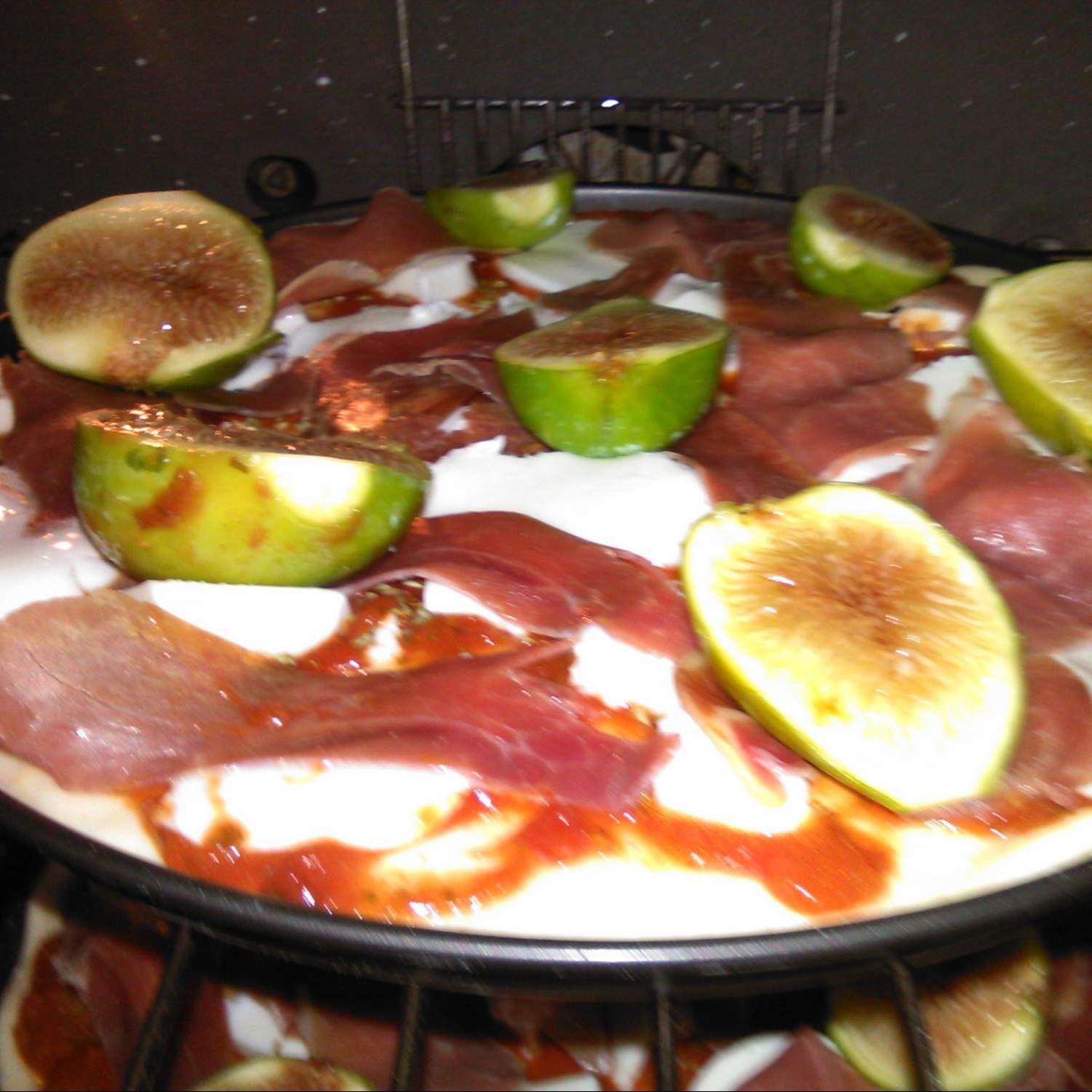 Cortar o queijo em fatias ou pedaços e colocar sobre a massa, dividir as fatias de presunto em pedaços e colocar também sobre o queijo, por cima dispor as metades dos figos e levar ao forno, aproximadamente 20/25 minutos.