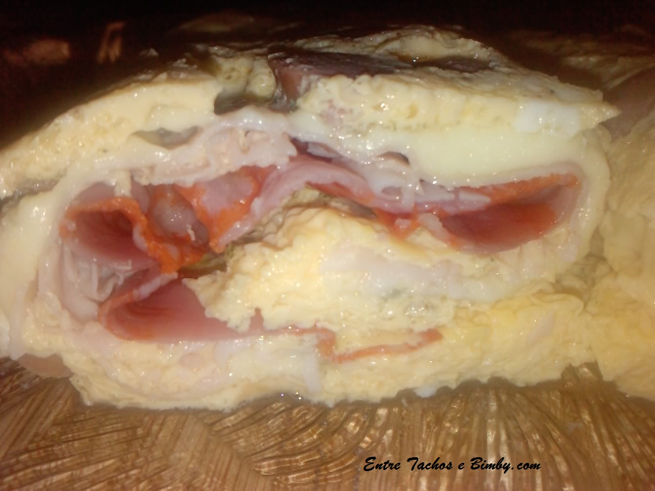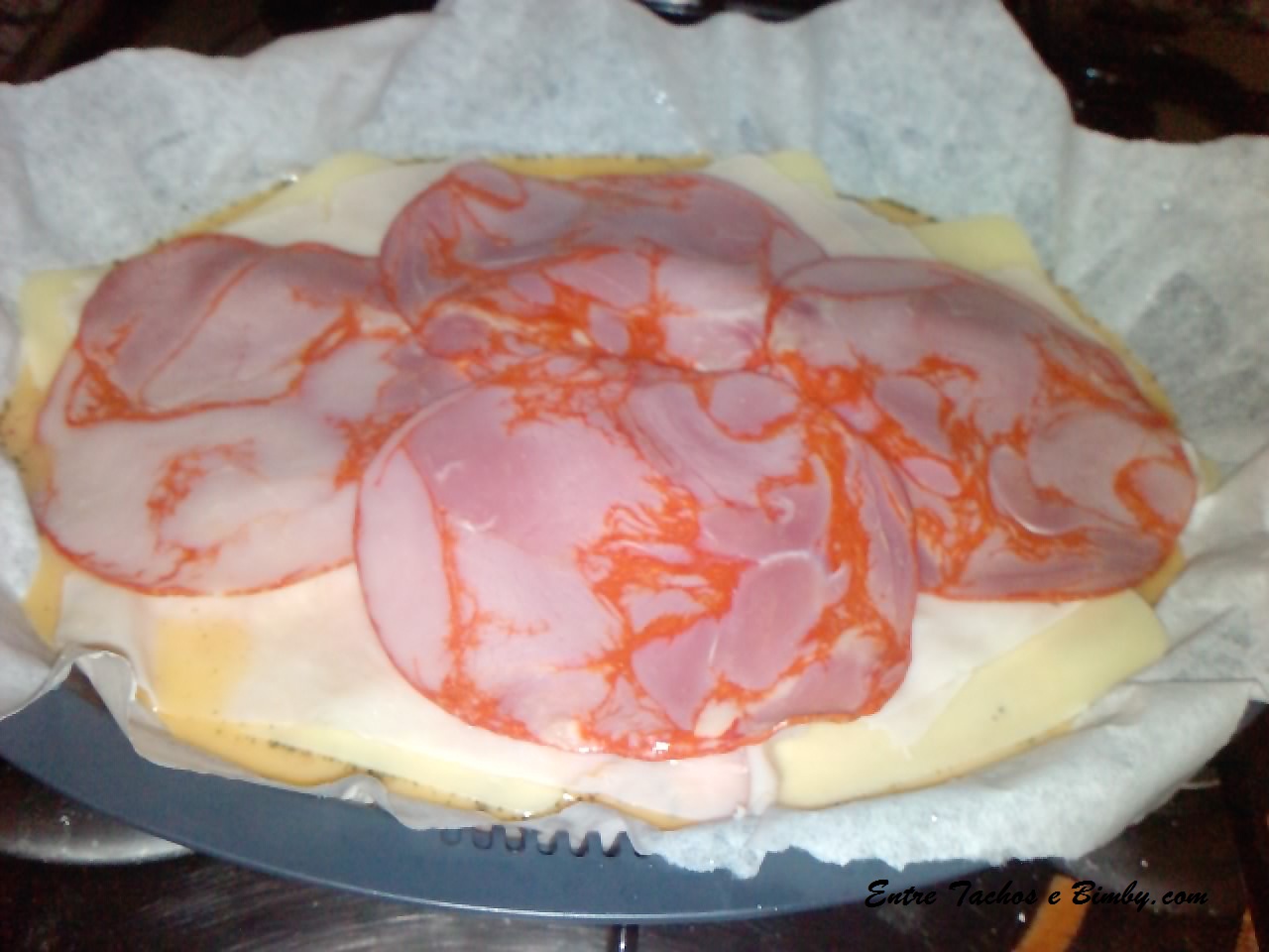 3.Num recipiente bata os ovos, o leite, o alho, a salsa, a pimenta, a noz-moscada e as salsichas. Forre o tabuleiro da Varoma com papel vegetal humedecido com um pouco de água. Verta o preparado anterior e disponha por cima as fatias de queijo, do fiambre e do paio.