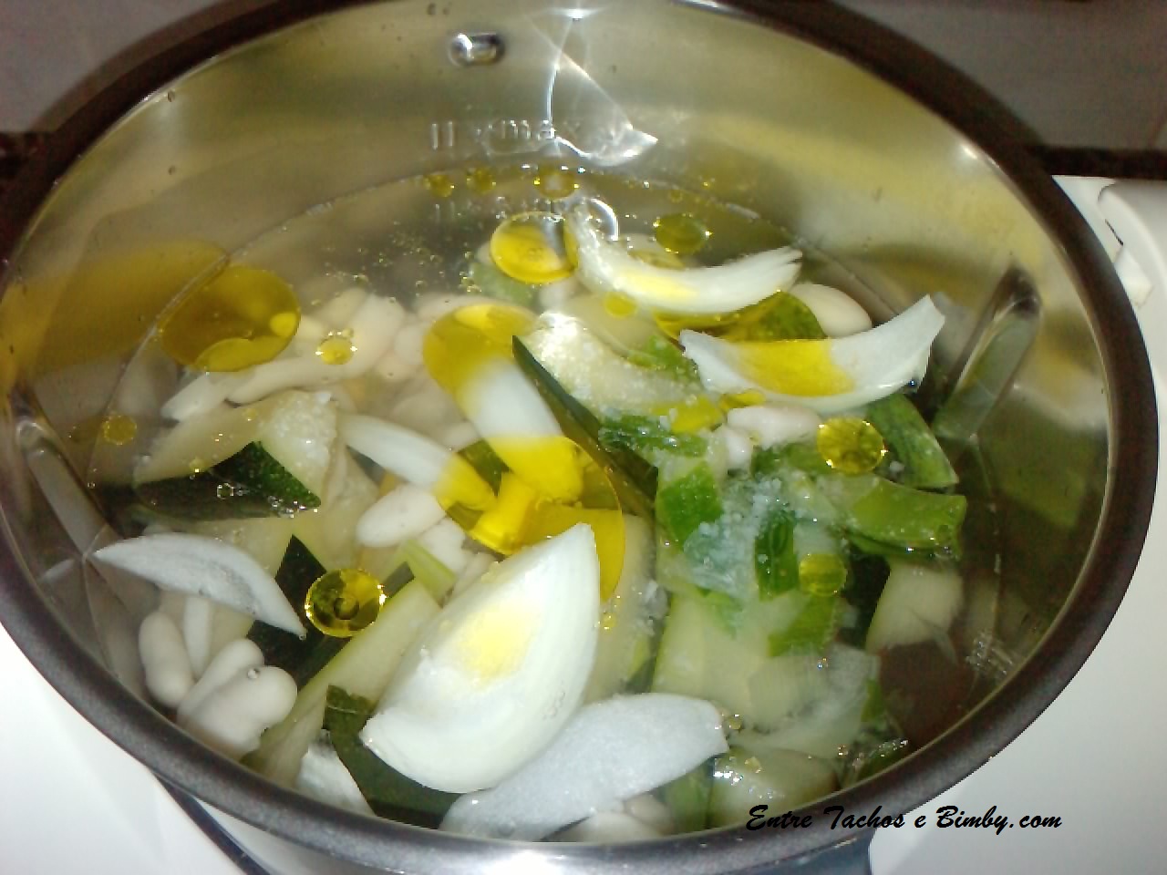 4.Coloque no copo a curgete, a cenoura, o alho francês, o feijão verde, a cebola, o alho, o feijão branco, o caldo de galinha, o azeite, o sal, a água até perfazer a medida máxima de 2 litros a Varoma com o tabuleiro e programe 30 min/Varoma/ vel 1.