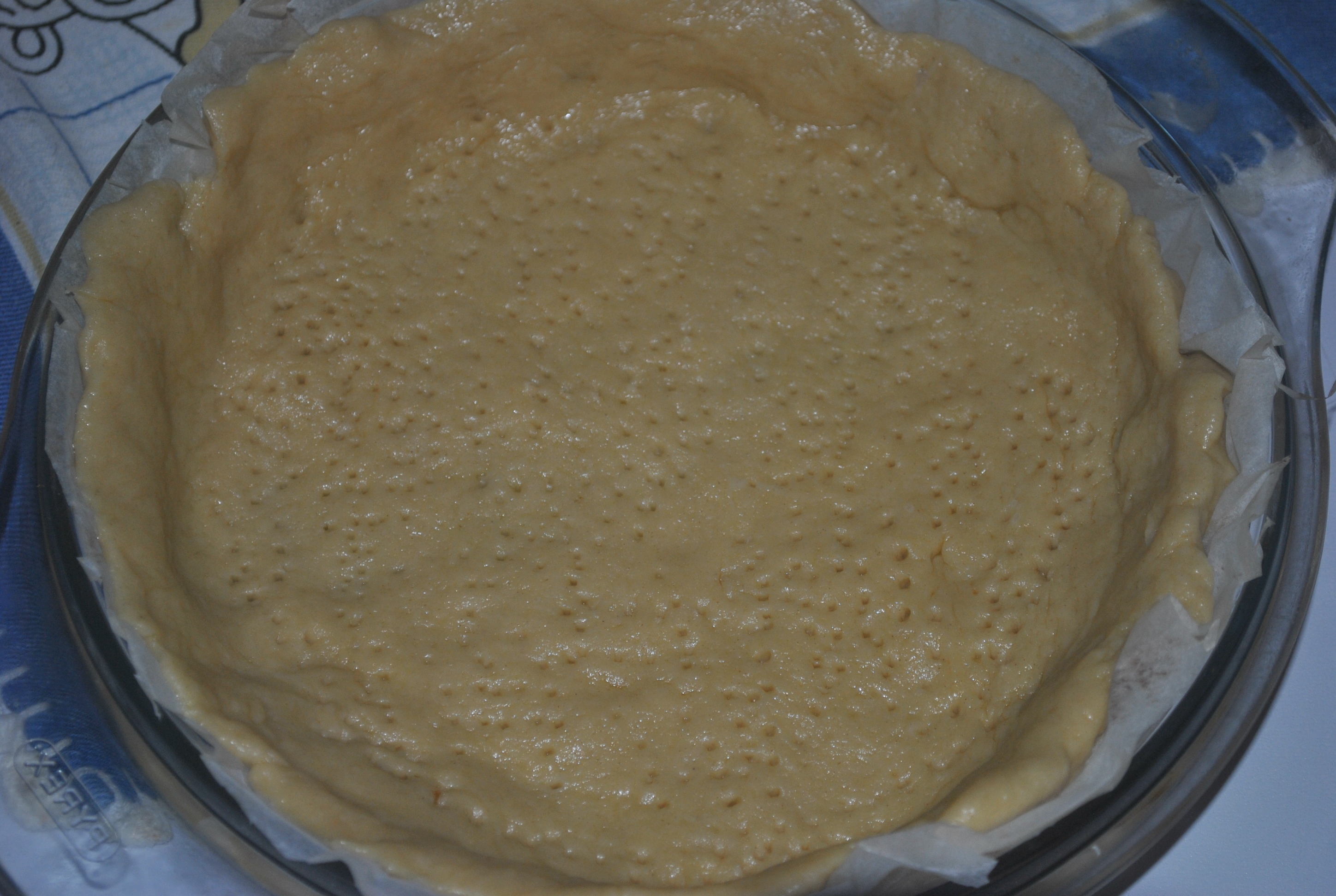 Forra-se uma forma para tarte com a massa e pica-se o fundo com um garfo.