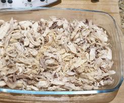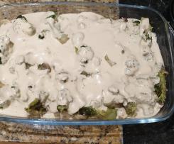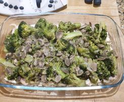 Caçarola de frango com cogumelos e bróculos, com molho de caju e côco