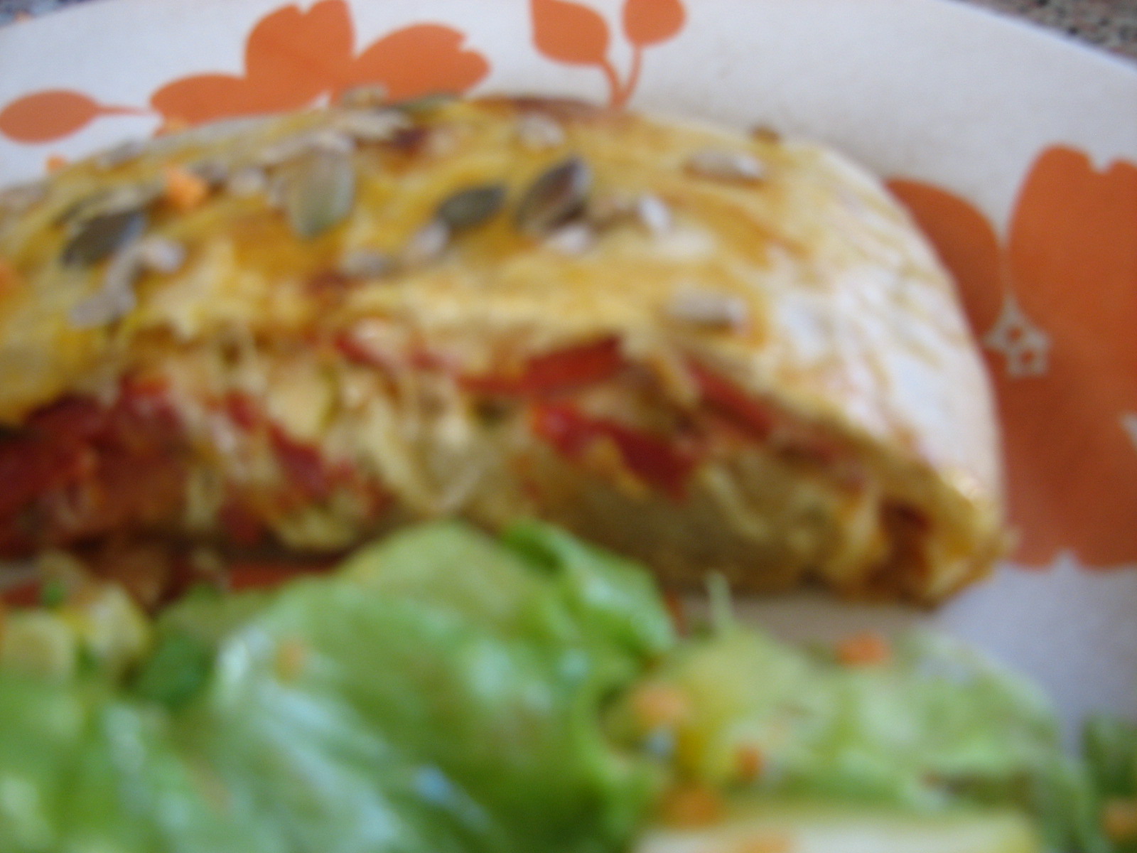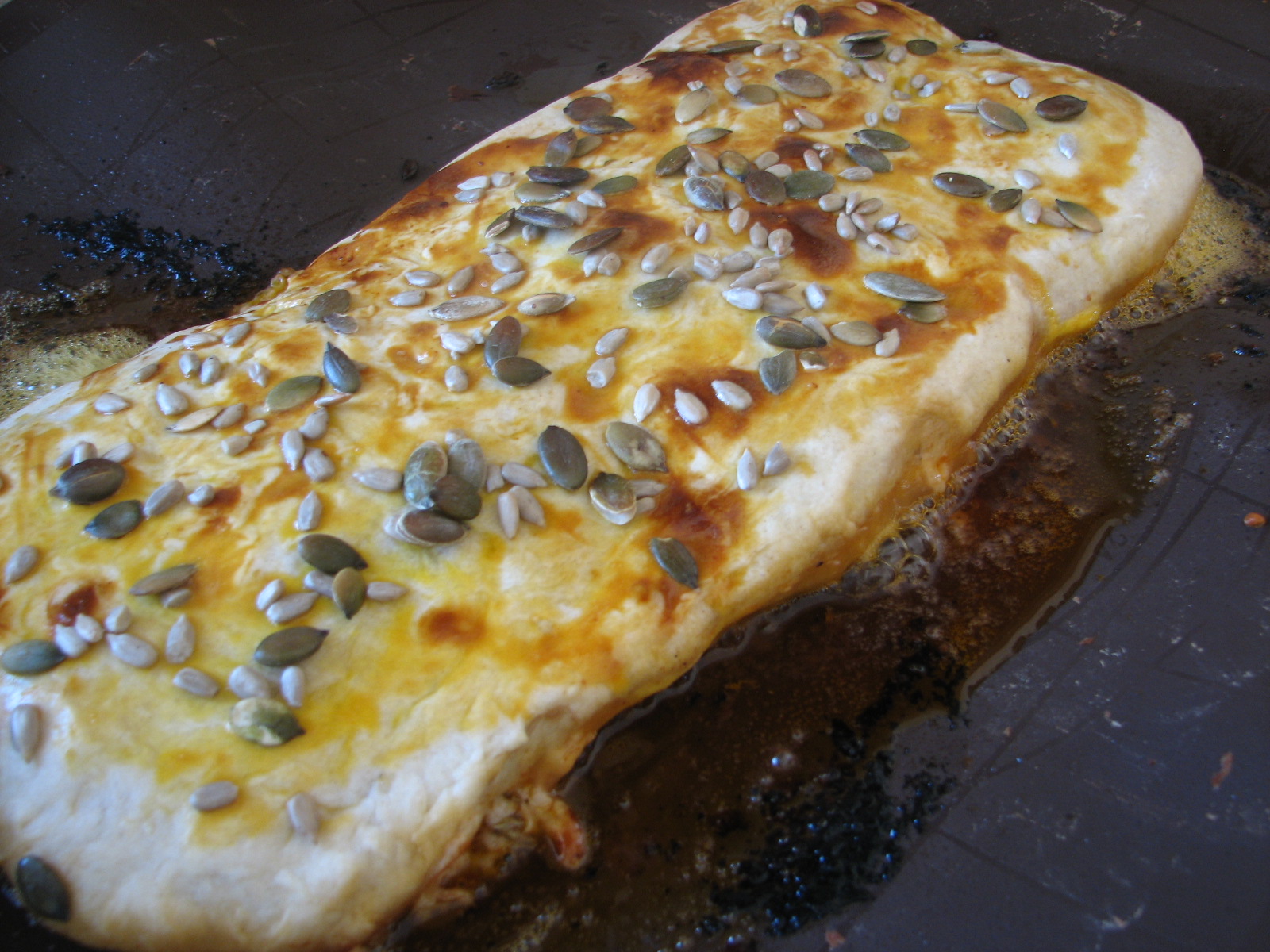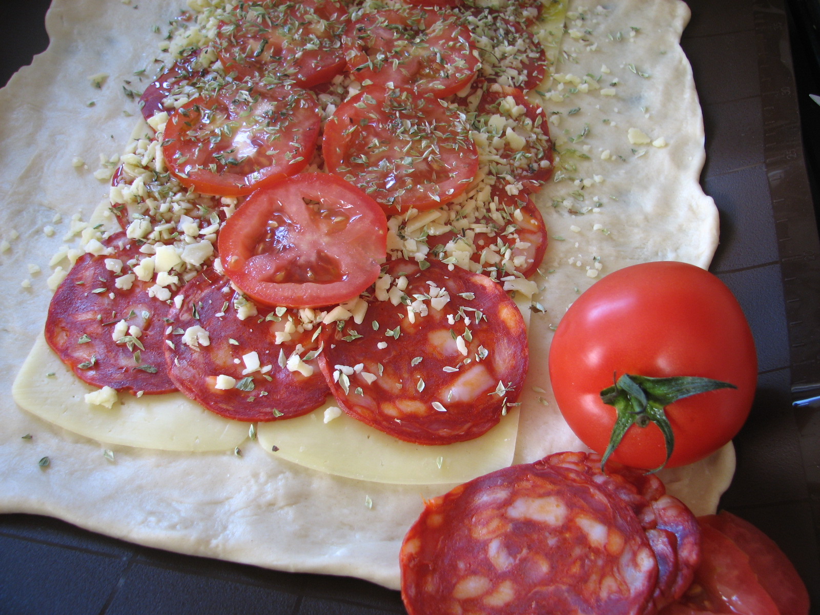 Sobre a massa coloque as fatias de queijo, por cima o chourição, e polvilhe com queijo ralado, coloque as rodelas de tomate, regue com o azeite e polvilhe com oregãos.