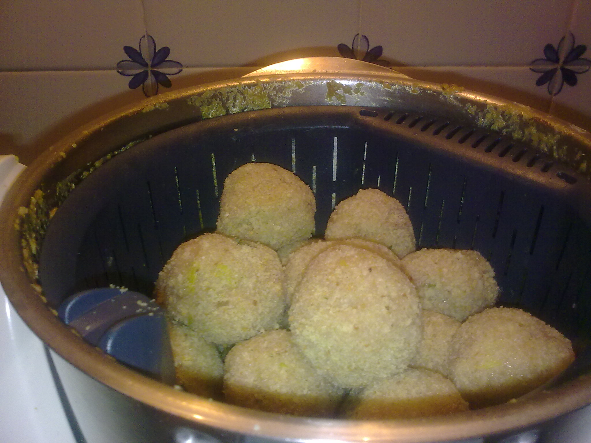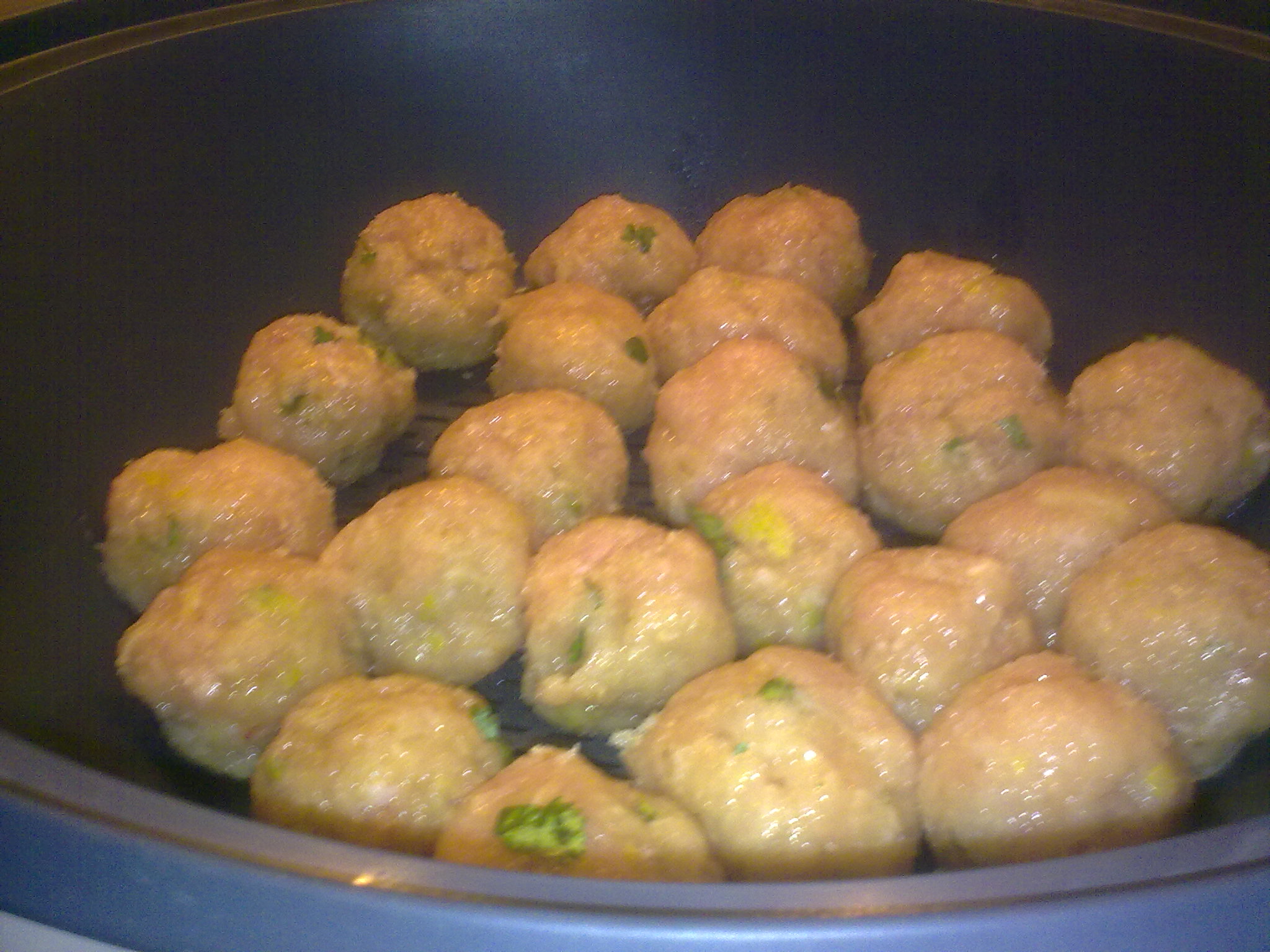 "Colher de pau" . Retirar e Moldar, com as mãos humedecidas , bolas pequenas,(30 grs) , colocar no cesto e na Varoma. (Não deve encher demasiado o cesto porque sendo a carne mais macia terão tendência a ficar achatadas