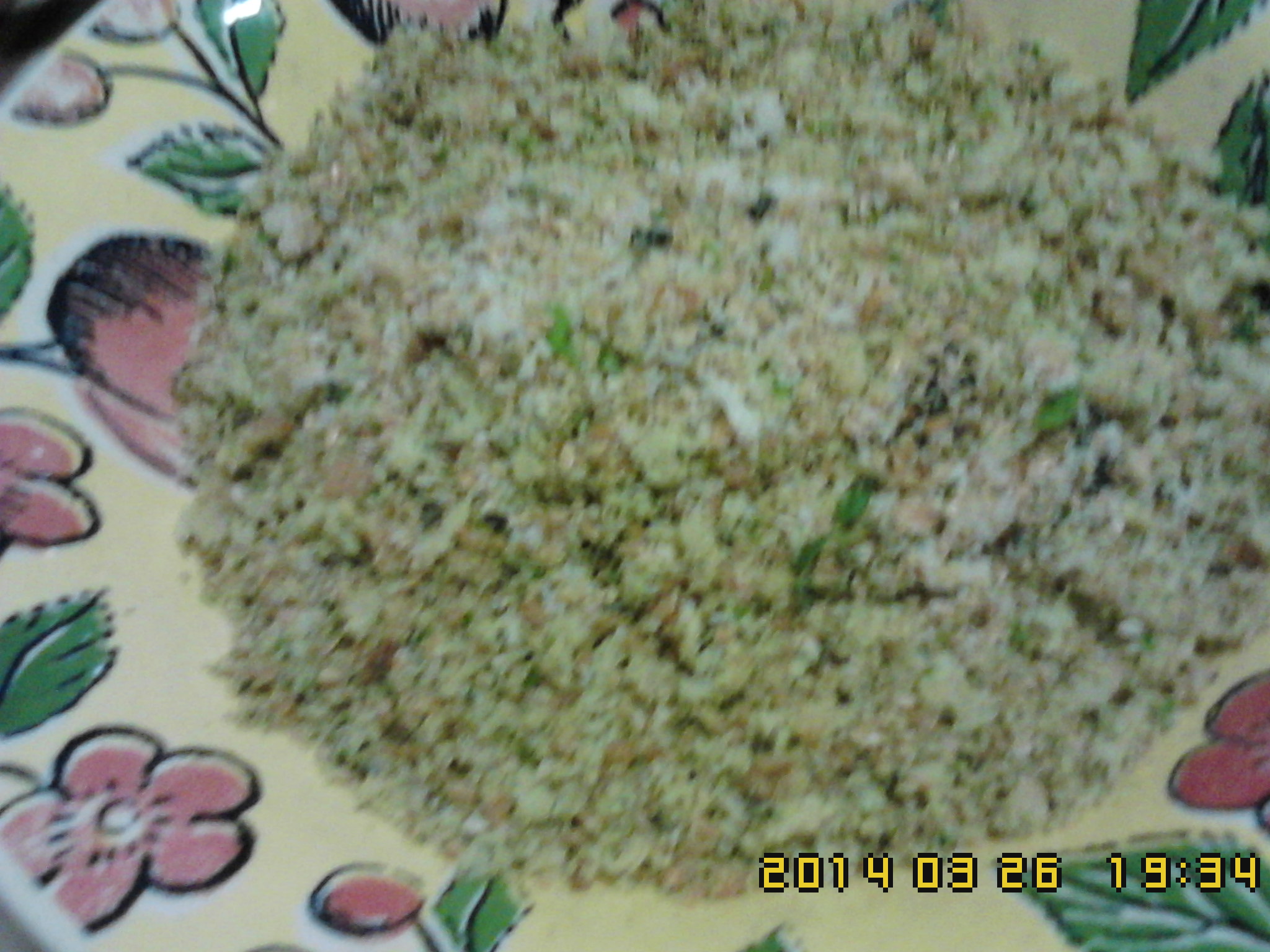 1) Ponha no copo a cebola,pão,alhos,coêntros,salsa,poejos,tomilho,sementes de sésamo e linhaça,soja granulado, Tirture V5 a 7-25s.Reserve num prato.