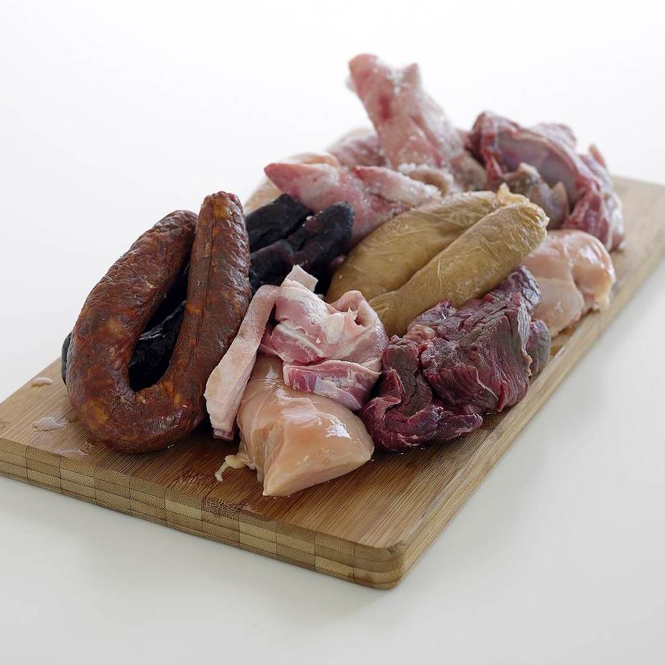3. Coloque no copo a entremeada, o entrecosto, a carne de vaca, a orelha e o chispe. Cubra com água até ao limite dos 2 litros, coloque a Varoma e programe 50 min/Varoma/vel Colher de pau"Colher de pau" . Retire a Varoma e reserve.