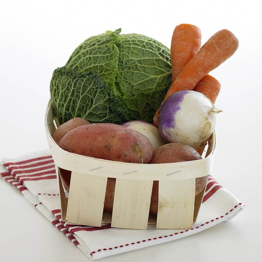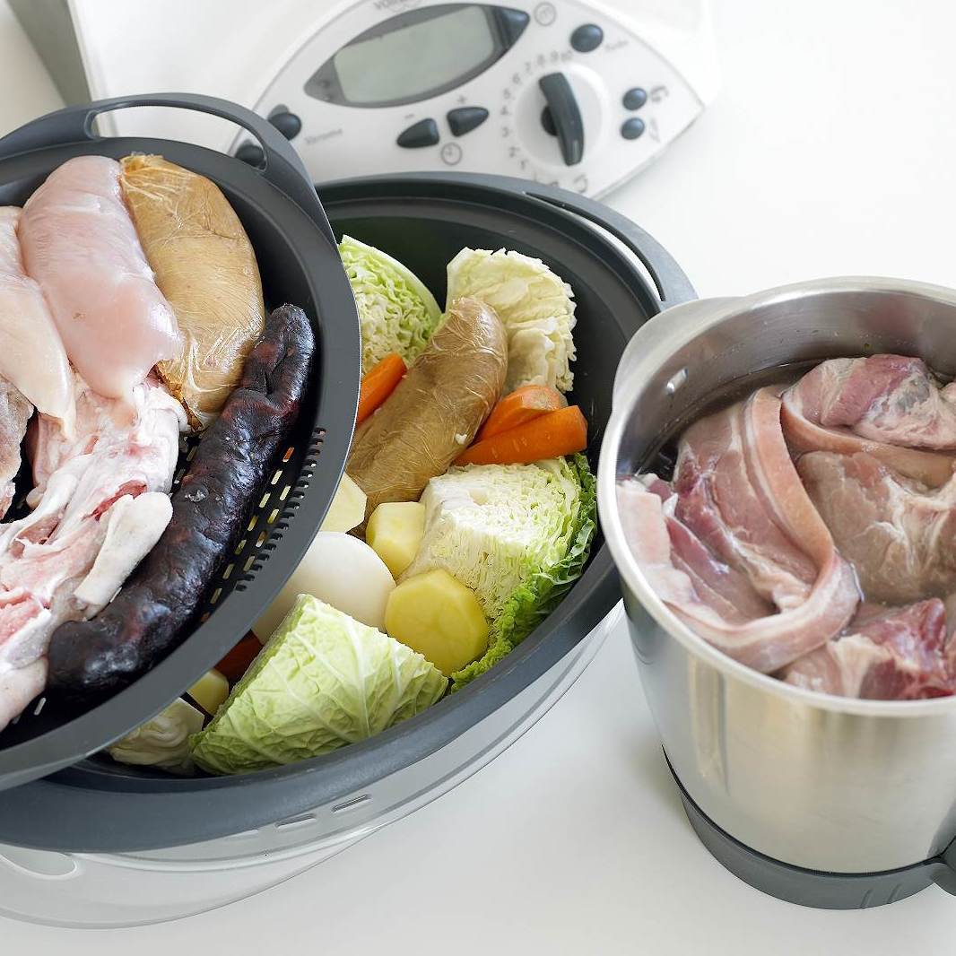 2. Coloque na Varoma, a couve, a cenoura, a batata, o nabo, o frango, a farinheira, o chouriço de carne e de sangue. Salpique com sal e reserve.