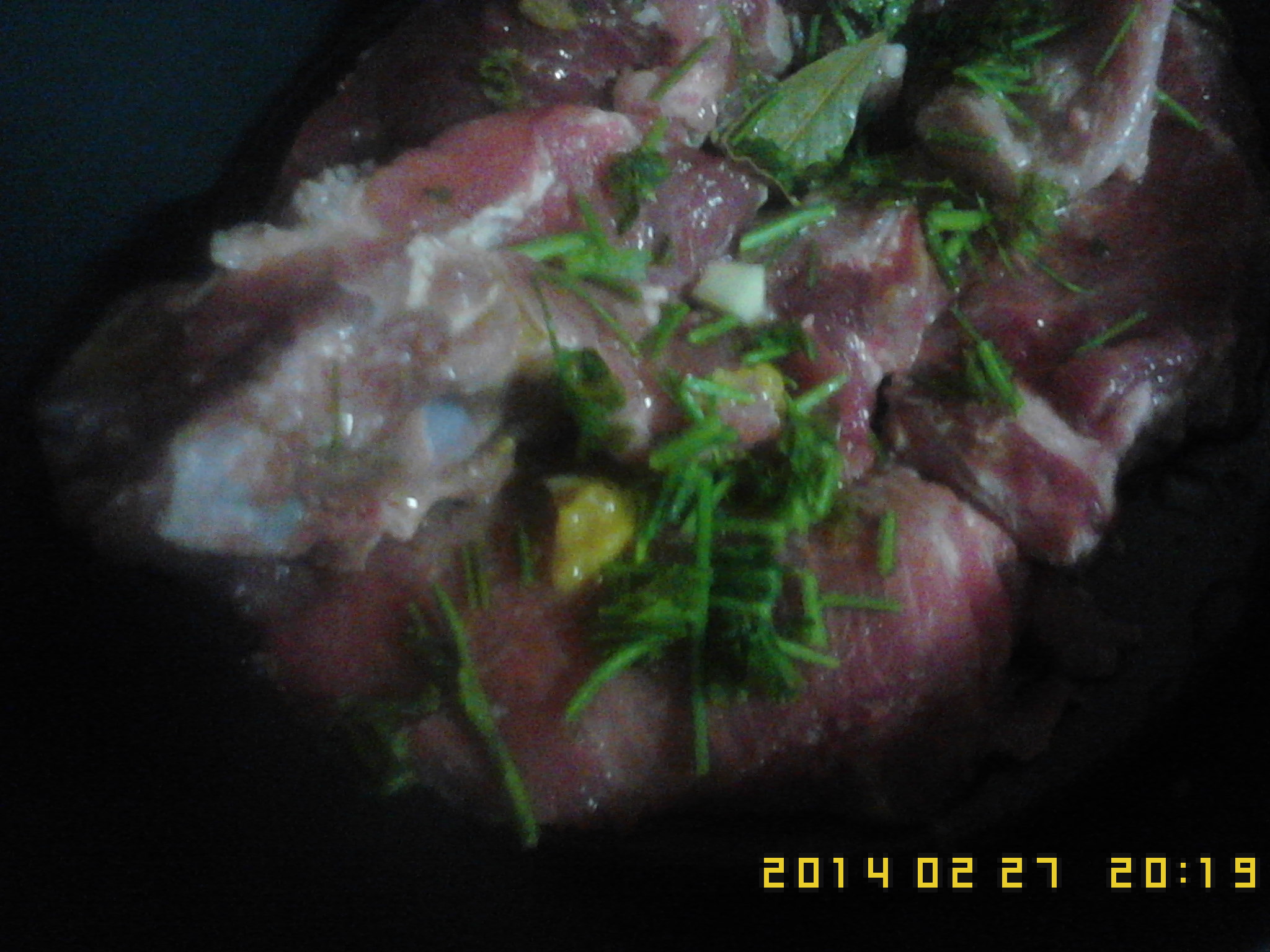 1) Cortar o entrecosto em tiras finas.Tempere numa travessa,sal,sumo de limão,laranja,pitada de noz moscada,com uma folha de loiro.Deixe marinar 15m,for mais melhor.