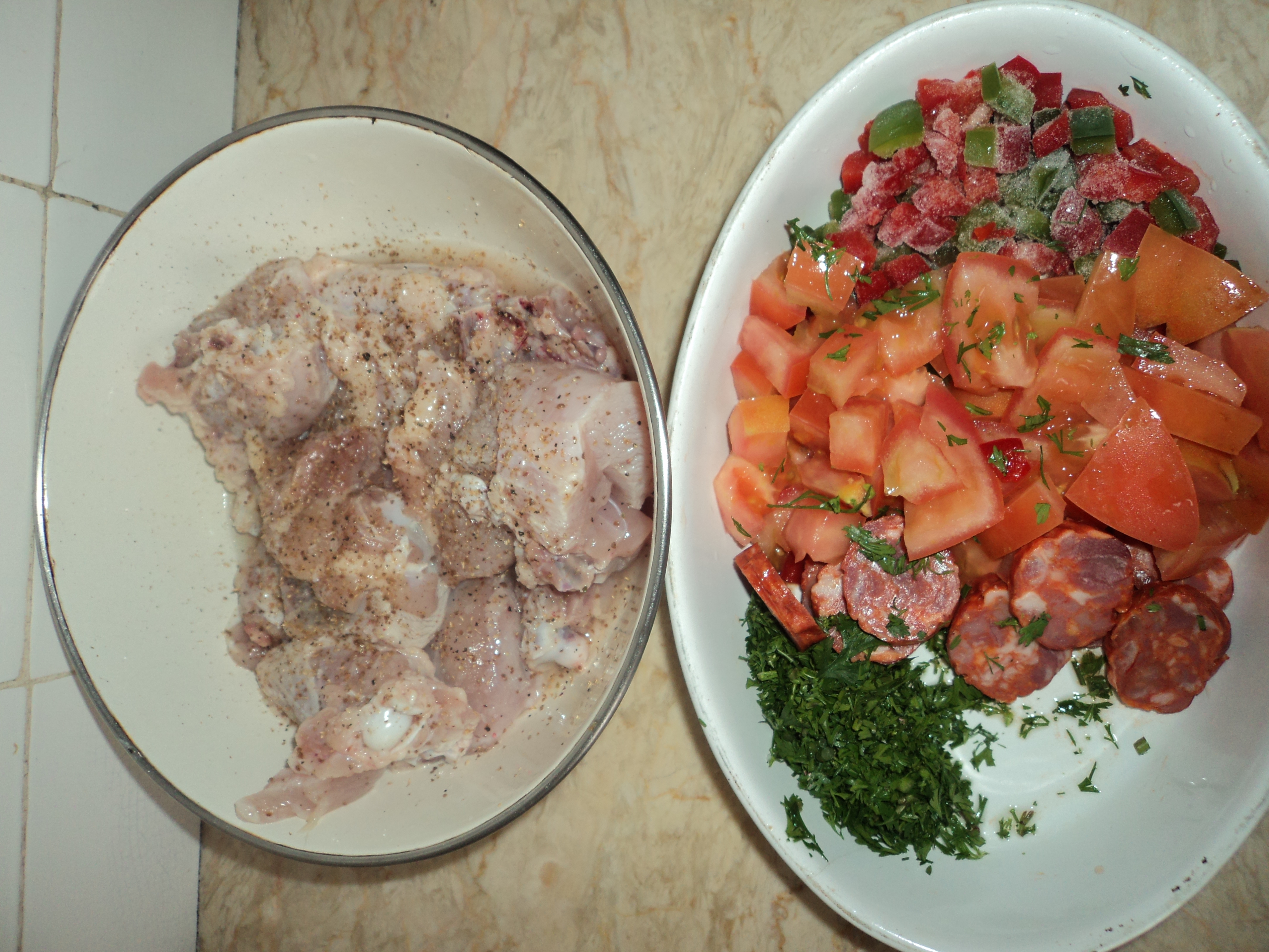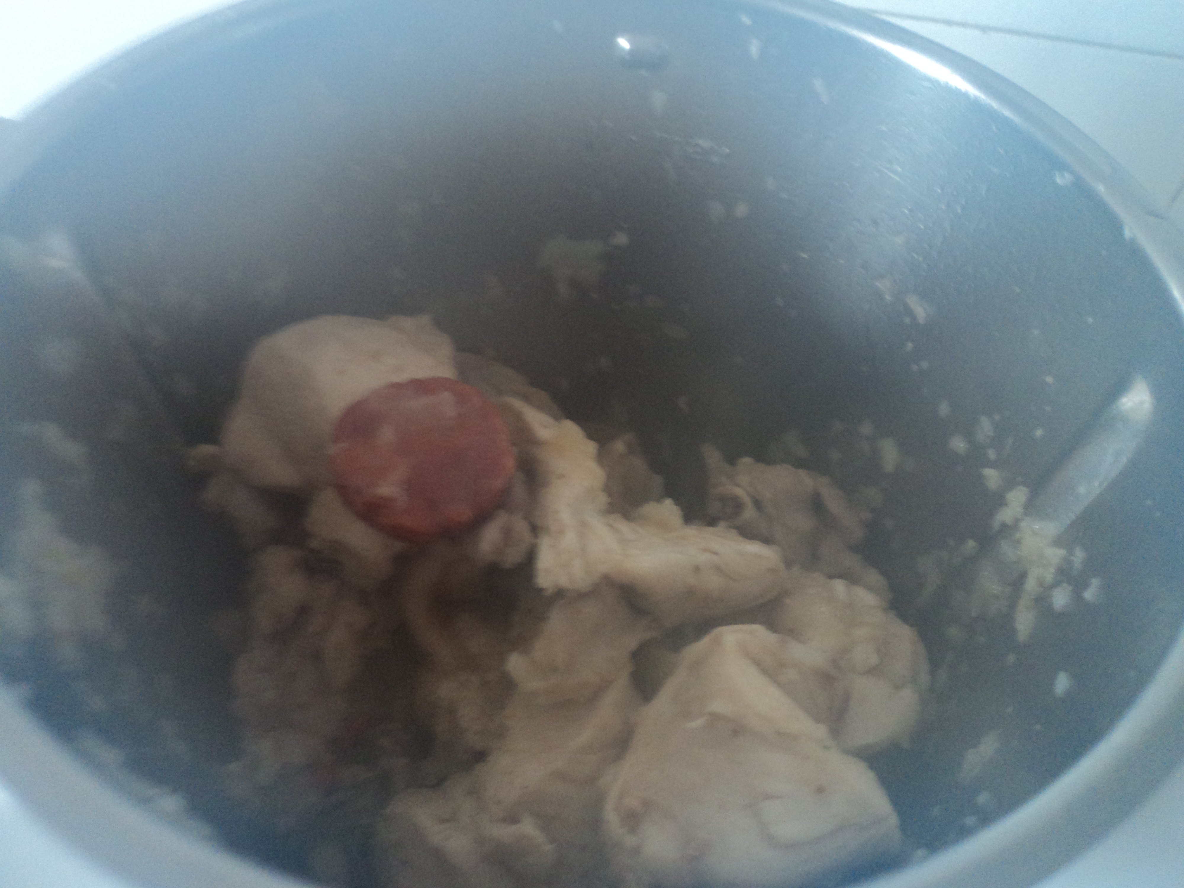 "Tampa fechada" o alho e a cebola 5seg, vel.5. acrescente o azeite e as folhas de louro e programe 5min. varoma vel.2.Junte o frango e as rodelas de chouriço, 10min. varoma
