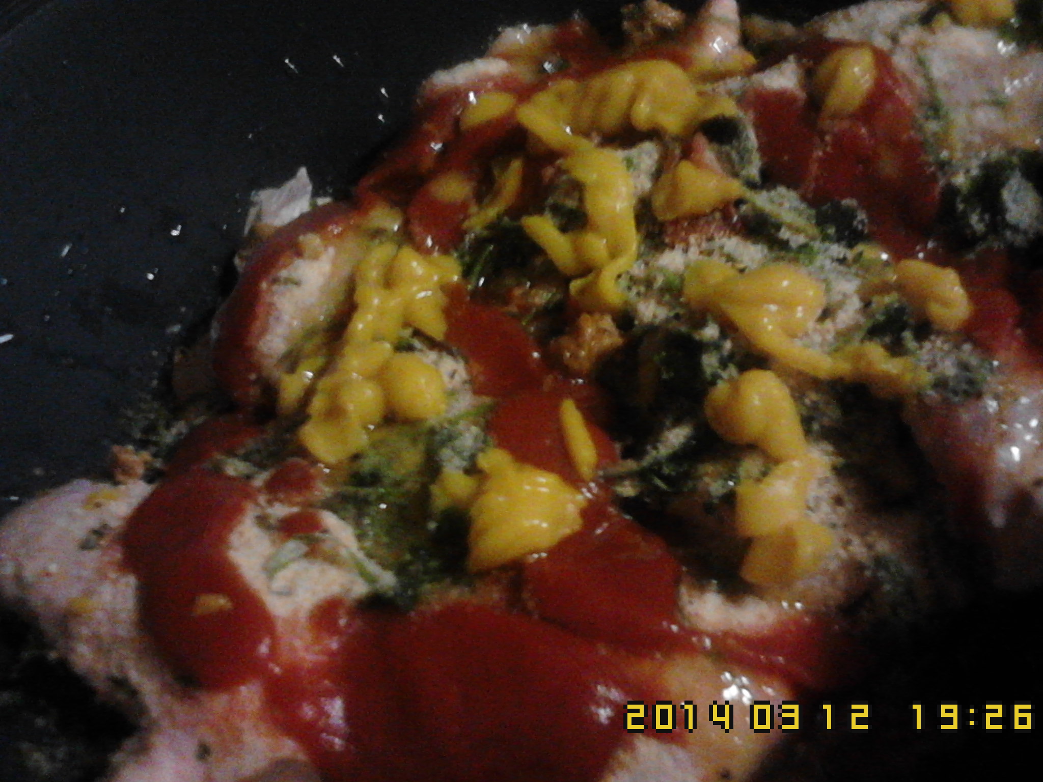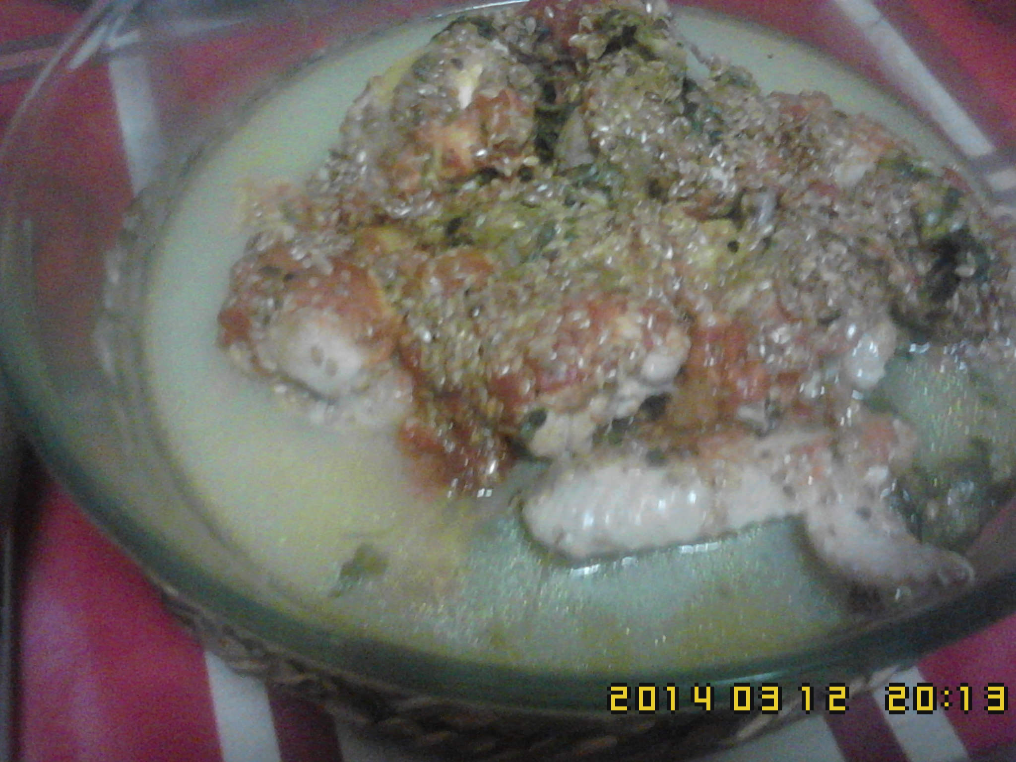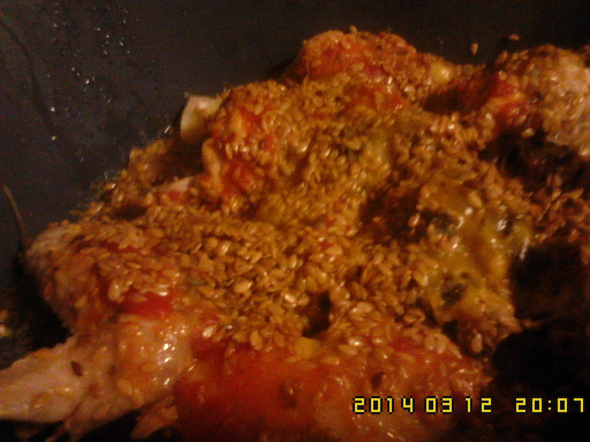 4) Continuando em cima do frango,caldo de frango desfeito,pitada de pimenta preta,molho de tomate,mostarda,sementes de linhaça,sésamo.Por fim o azeite.45m-V2-100C.Bom apetite