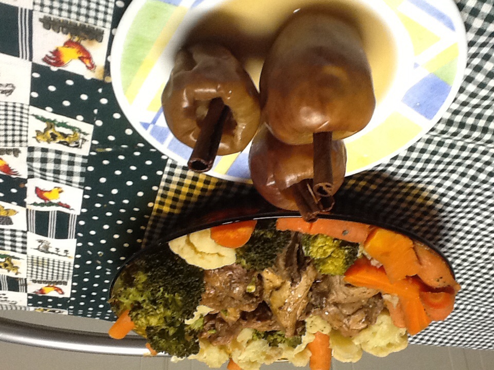 Ybretirar um pouco do centro das maçãs, epetar um pau de canela e colocar açúcar amarelo, enrolar as maçãs em papel de alumínio e colocar na varoma juntamente com os legumes.