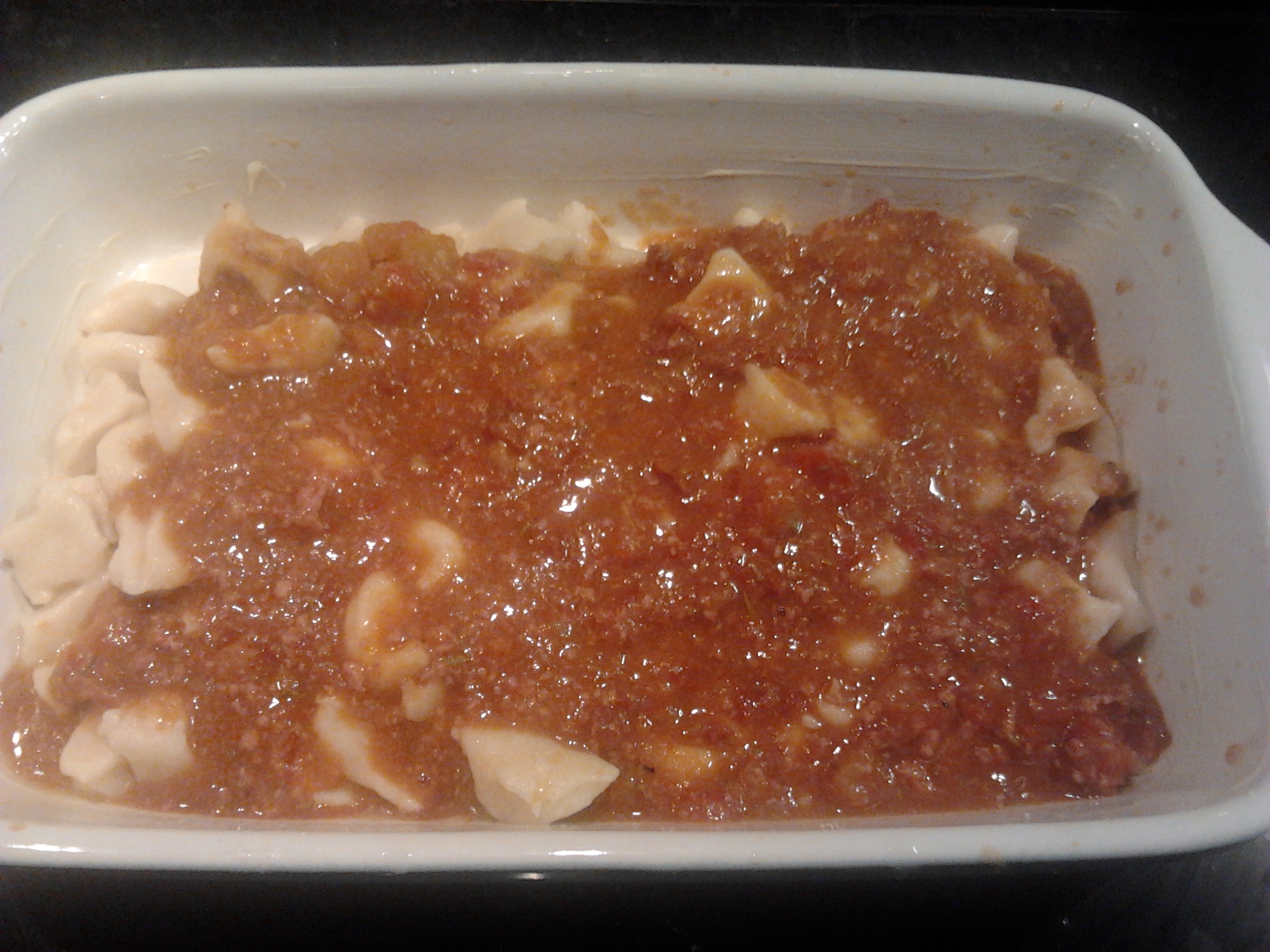 Colocar sobre esta metade dos gnocchis metade do molho, fazer nova camada de gnocchis e colocar o restante molho. Polvilhar com as restantes 50 g de queijo e levar ao forno cerca de 15 min.