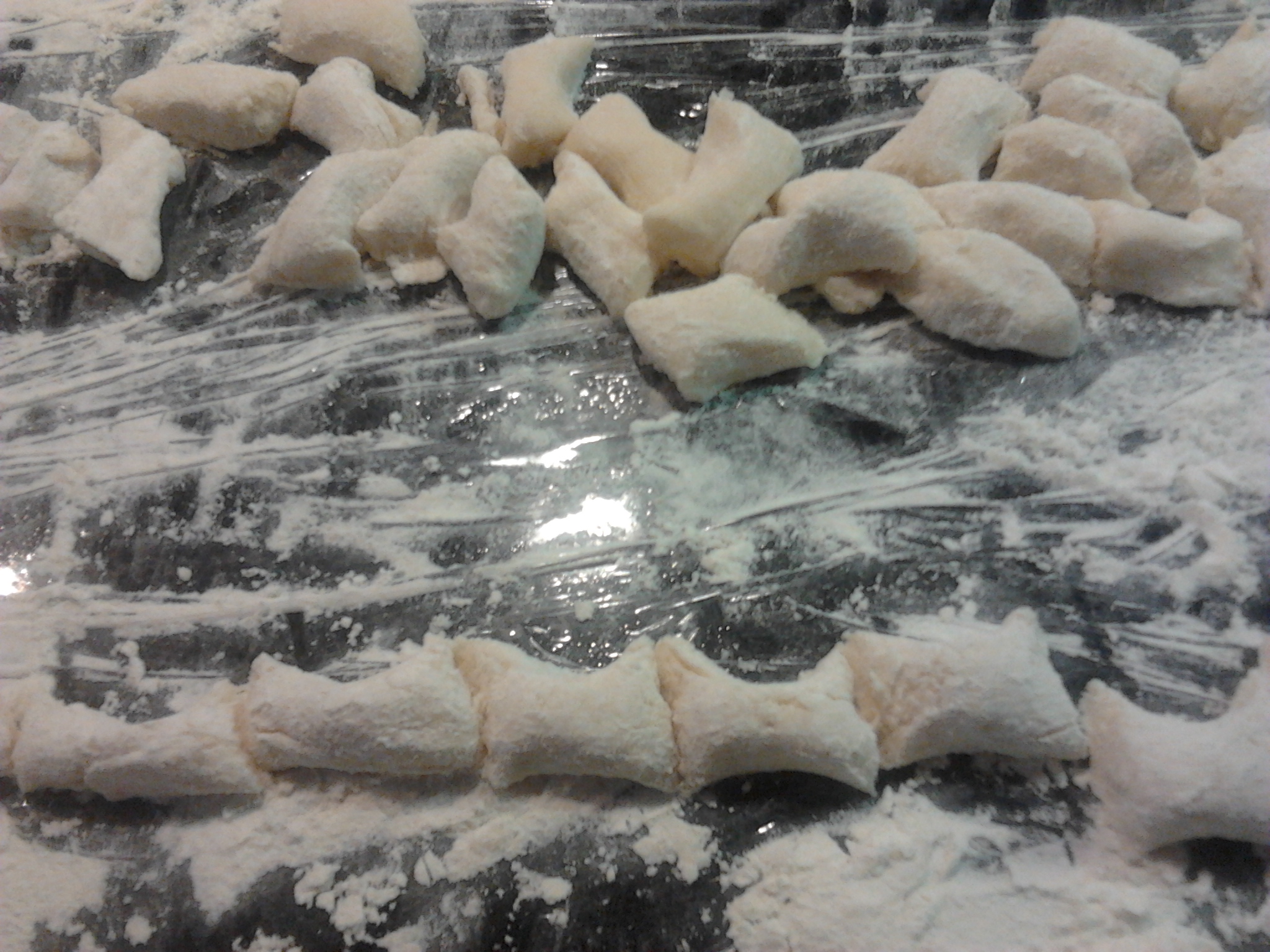 Entretanto, numa superficie polvilhada com farinha, fazer rolos com metade da massa de feijão preparada com aprox. 2cm de diametro. Cortar pequenos pedaços cm +/- 2cm de largura.