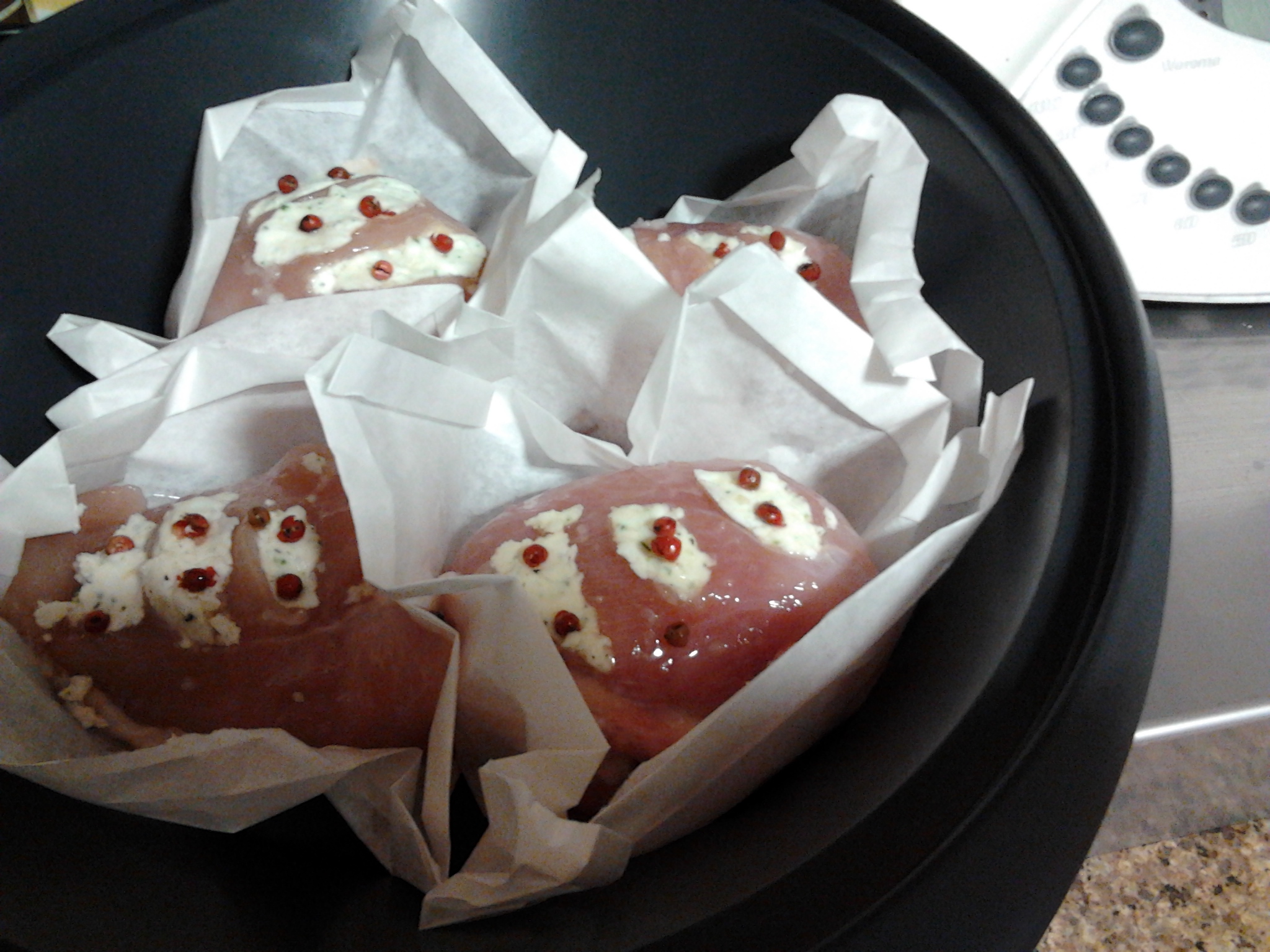 Dar uns golpes nos peitos de frango para introduzir a manteiga. Temperar com sal e pimenta rosa. Embrulhar em papelotes de papel vegetal e colocar na varoma.