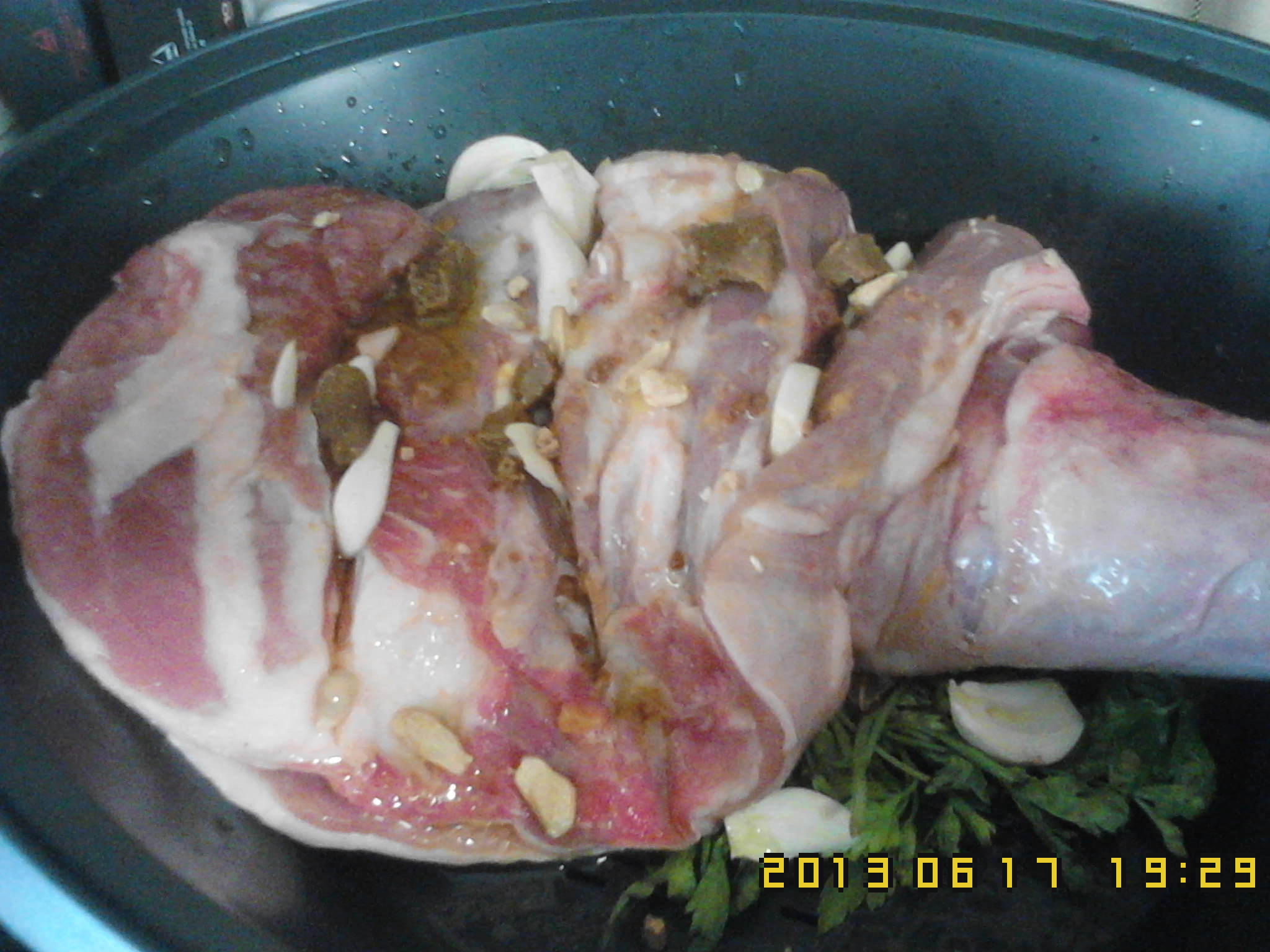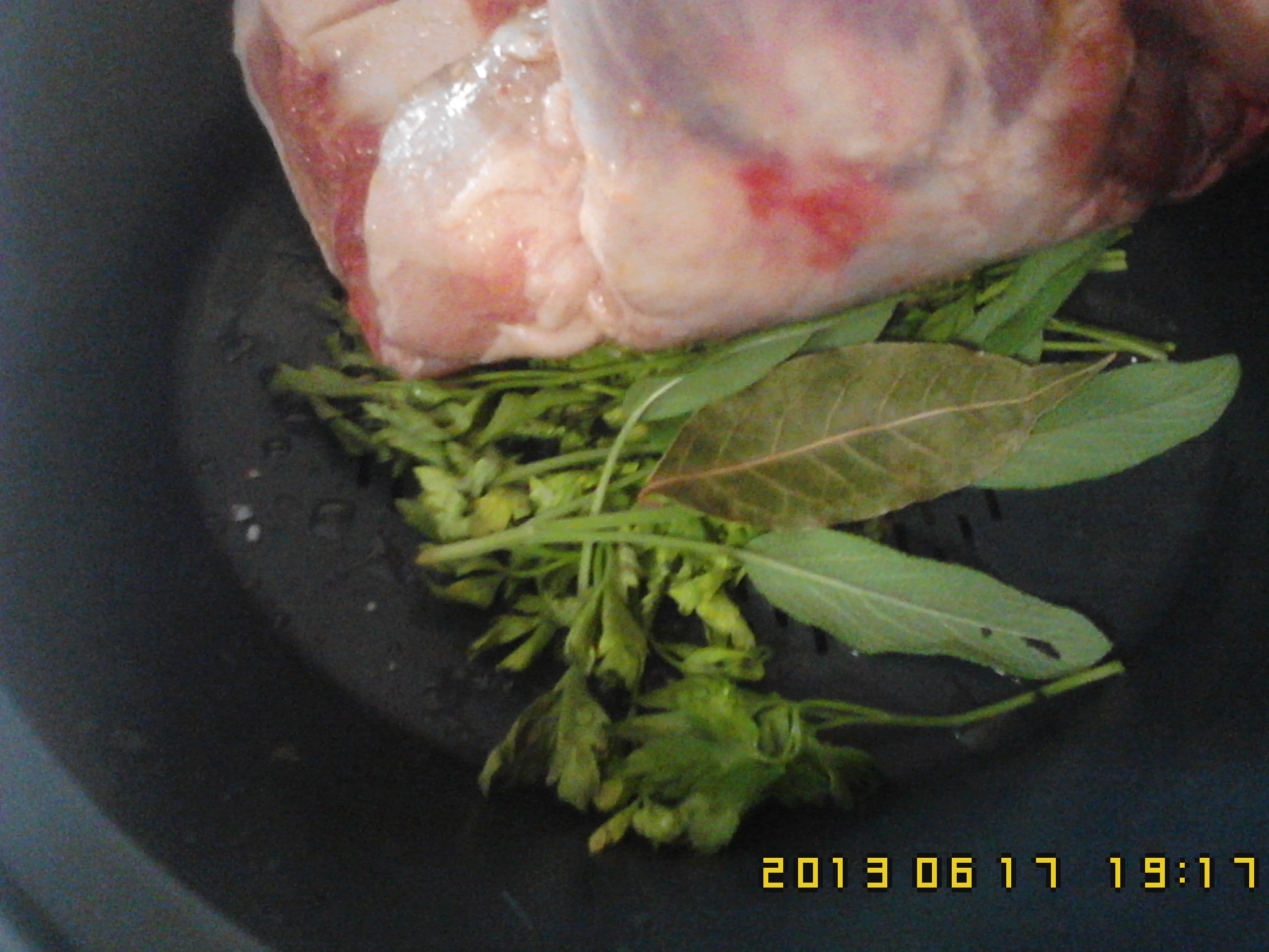 3-Coloque,a perna de peru, temperada com sal,em cima do loiro,salsa,salva.