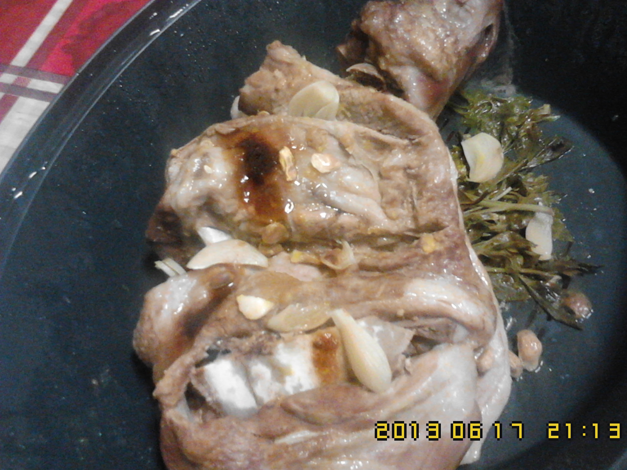 4-Em cima do peru,exprema as 3 laranjas,metade do limão,corte os alhos,caldo de kenorre de carnr,partido aos bucados.