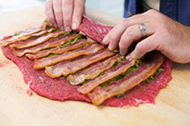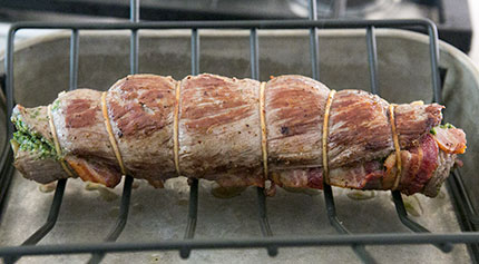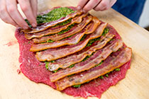 Espalhe uma camada fina de pesto na carne, deixando cerca de 1 cm de margem em todo o redor da carne. Disponha o bacon por cima, de forma a que cada tira caiba dentro da carne. Pré-aqueça o forno a 200º.