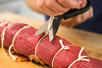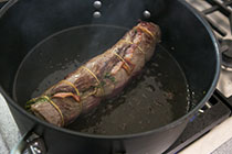 Enrole cuidadosamente a carne, apertando o mais possível, de forma a obter um rolo. Caso queira, corte o excedente do bacon que tenha ficado fora do rolo. Ate o rolo com fio próprio para cozinhar. Salteie o rolo na frigideira com a gordura reservada do bacon. Apenas de pretende alourar rapidamente o exterior do rolo, não cozinhá-lo por dentro.