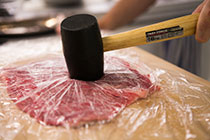 Coloque duas camadas de película aderente numa superfície plana e coloque os bifes em cima destas. Cubra novamente com película e usando um martelo de culinária, ou o fundo de uma garrafa vazia, bata nos bifes até estes terem cerca de 1,5cm de espessura. Vá virando a carne de vez em quando de forma a obter um resultado mais uniforme. Retire a película e continue a bater cerca de mais 1-2 mnts.