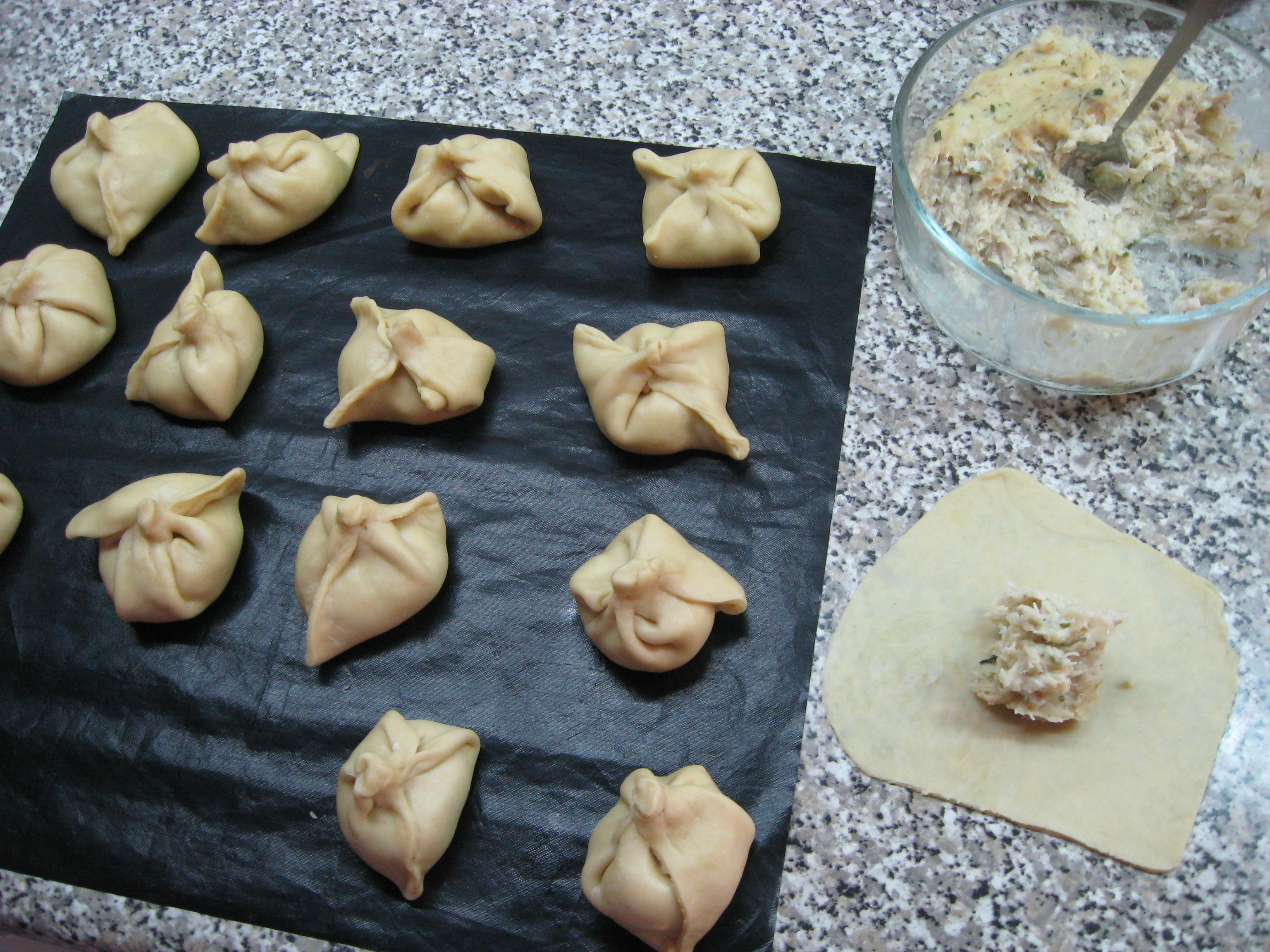 Tender com rolo pequenos quadrados de massa, colocar uma colher de sopa de recheio no centro, e fechar unindo para cima os 4 bicos do quadrado