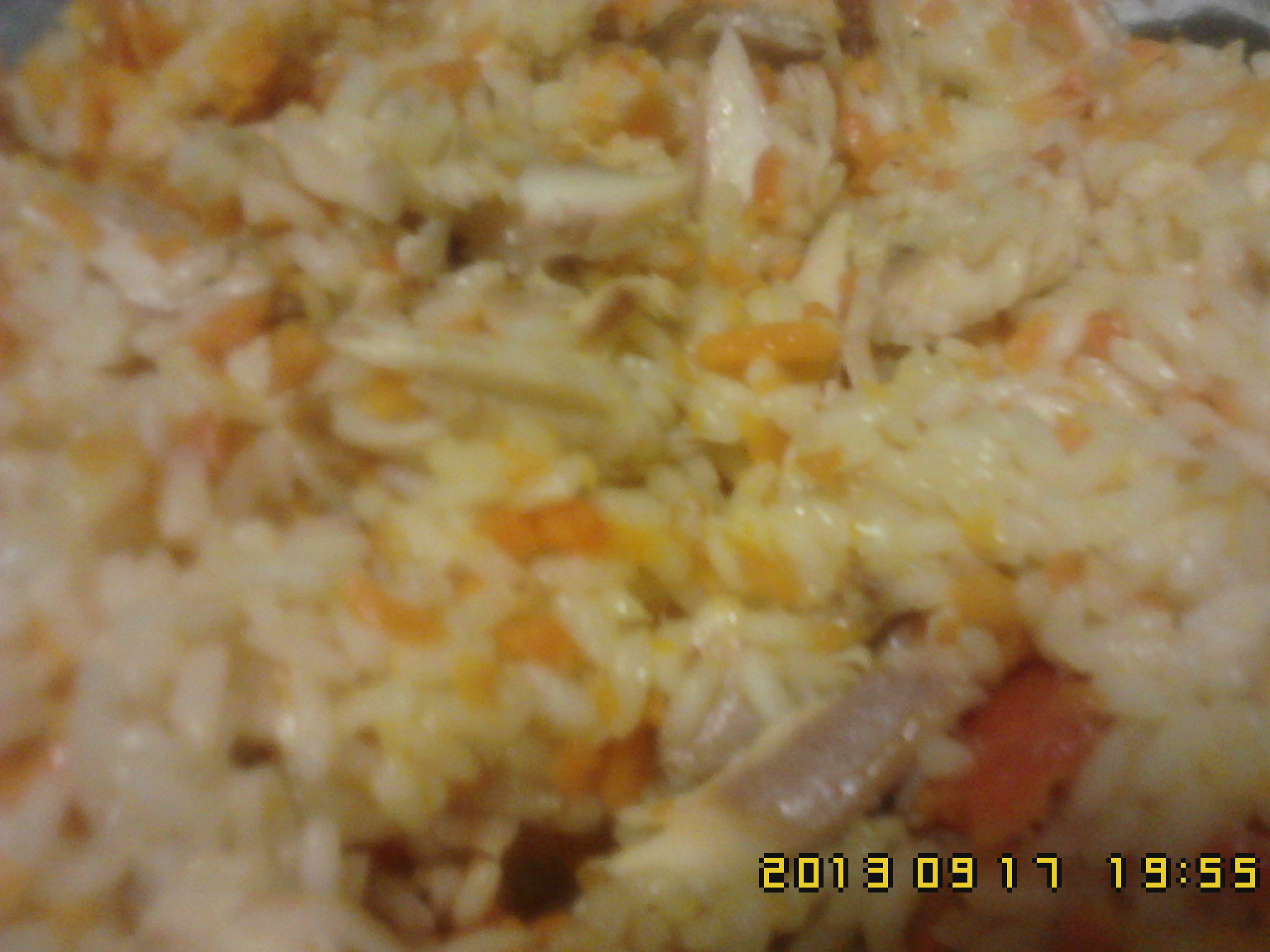 1)Por 2 trutas a vapor.Um litro e meio de água,no copo.Na tampa varoma as 2 trutas com sal.25m-100C.-V2.Reserve num prato.O peixe e a água para um recepiente.2)Metade da cebola,cenoura,alhos,azeite.Pique,5s-V5.Refogado,5m-V1-varoma,retire,para um prato.3)No copo,ponha 800ml da água do peixe,a seguir ponha o refogado no cexto com o arroz,25m-V1-100C.Nos ultimos 10m,ponha o peixe desfiado,juntamente com o arroz.Pronto a servir.
