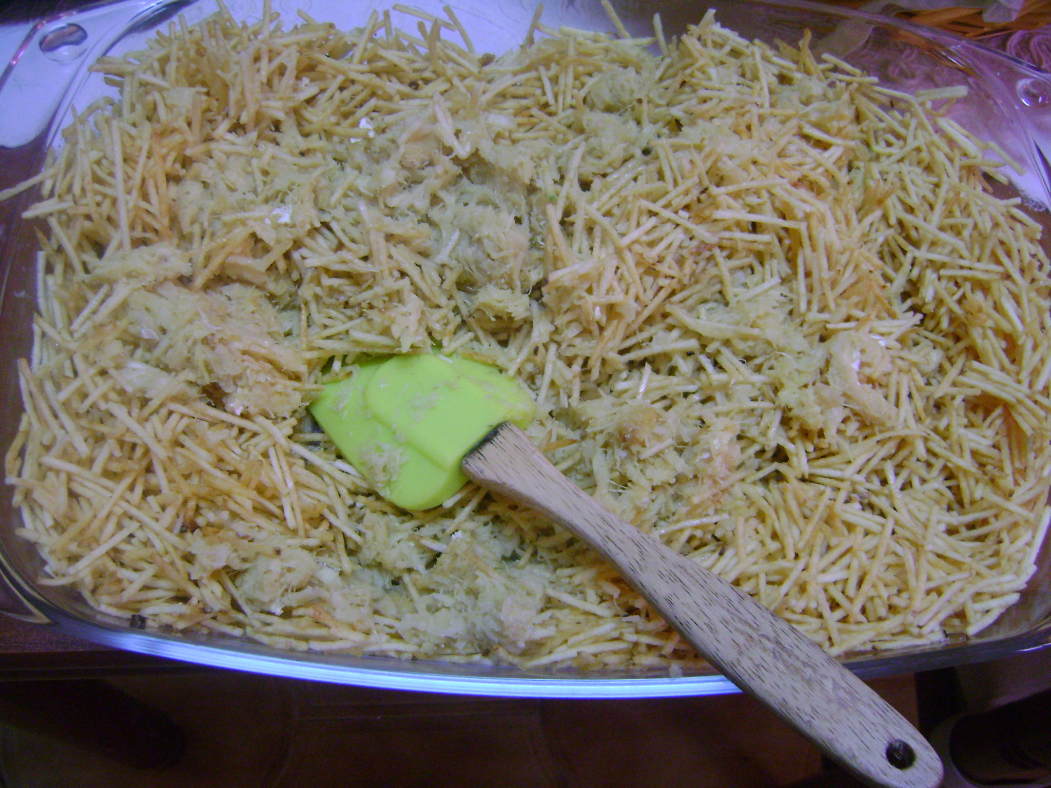 . - Coloque num pyrex alternadamente a batata, o bacalhau e com a ajuda da espátula envolva bem.