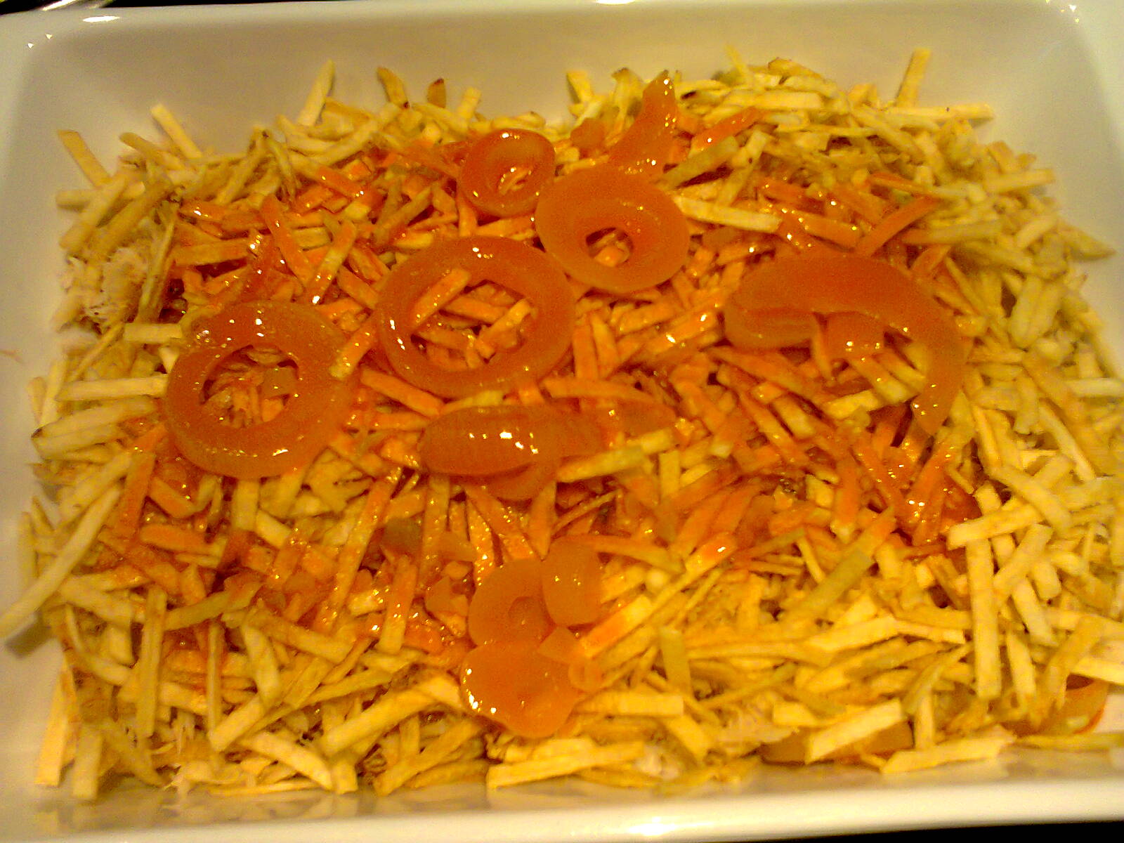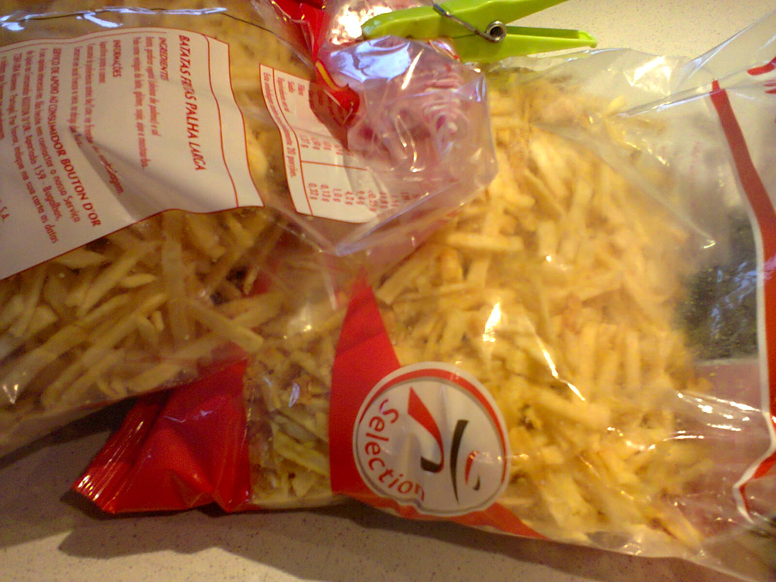 - 6 batatas, médias, cortadas aos cubos, fritas