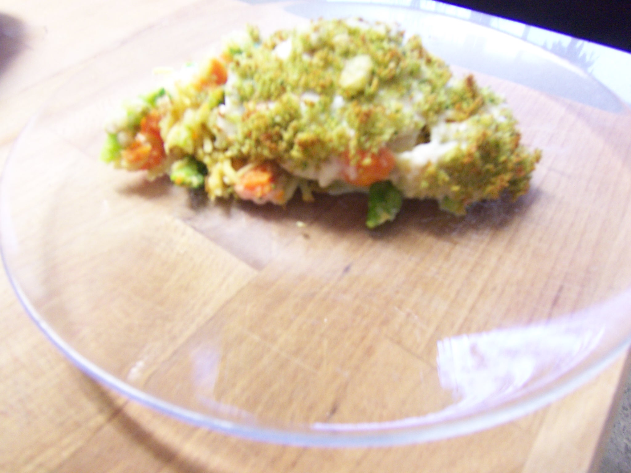 8. Adicione os camarões ou as delicias e programe 2 min/90ºC/vel 3. Retire e verta por cima do bacalhau polvilhe com o pão ralado. Leve o pirex ao forno durante 20 min ou até lourar. Sirva com uma boa salada.