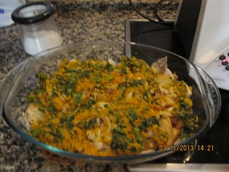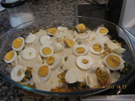 Faz-se o béchamel. Entretanto as batatas já devem estar prontas e colocam-se num pirex. faz-se a seguinte mistura por camadas : bacalhau, cenoura e grelos, ovos ás rodelas e cobre-se com o béchamel.