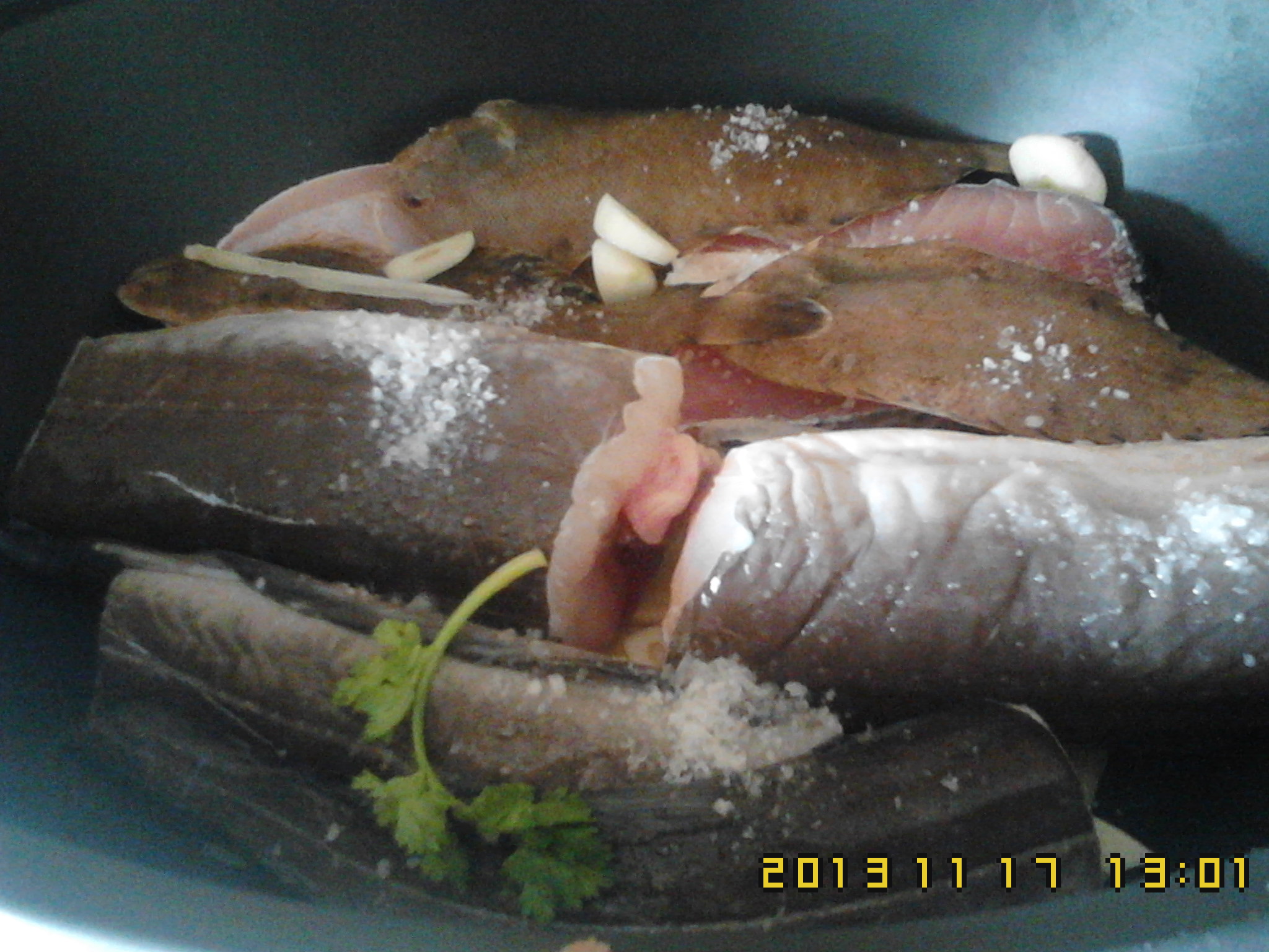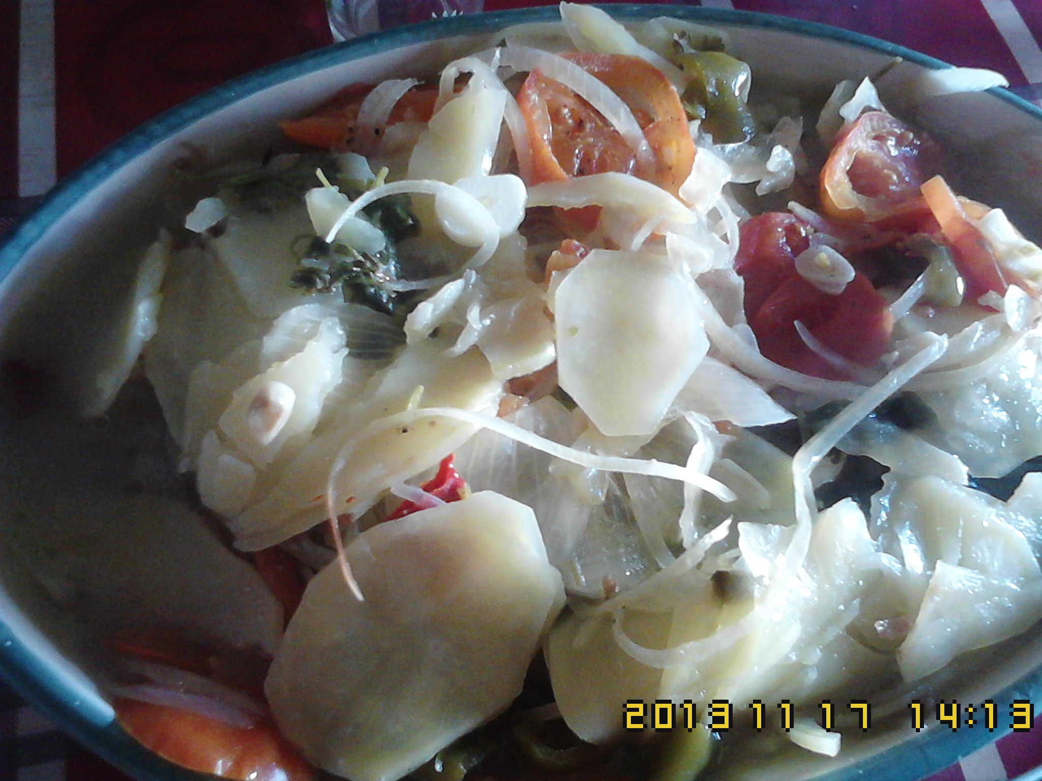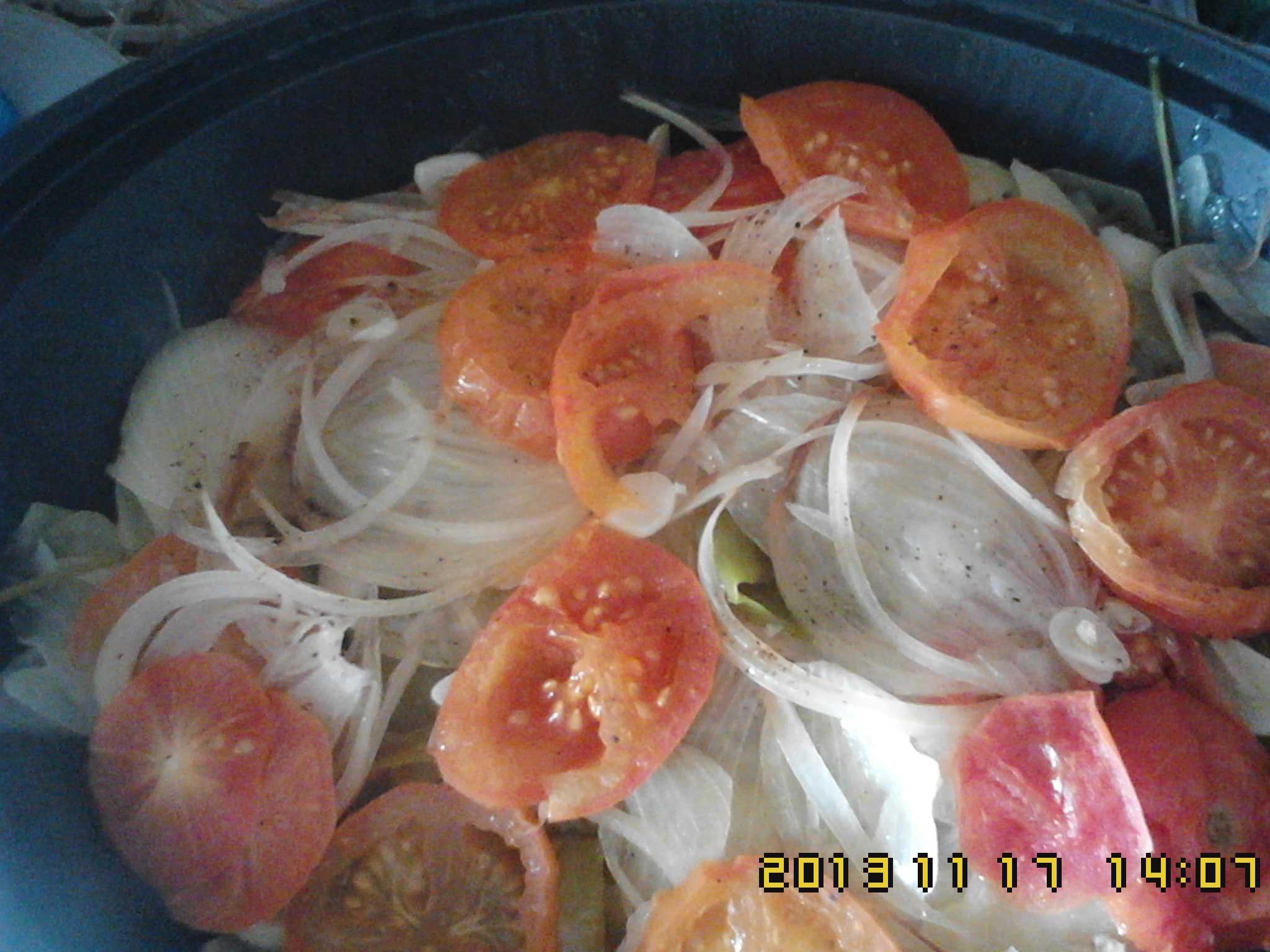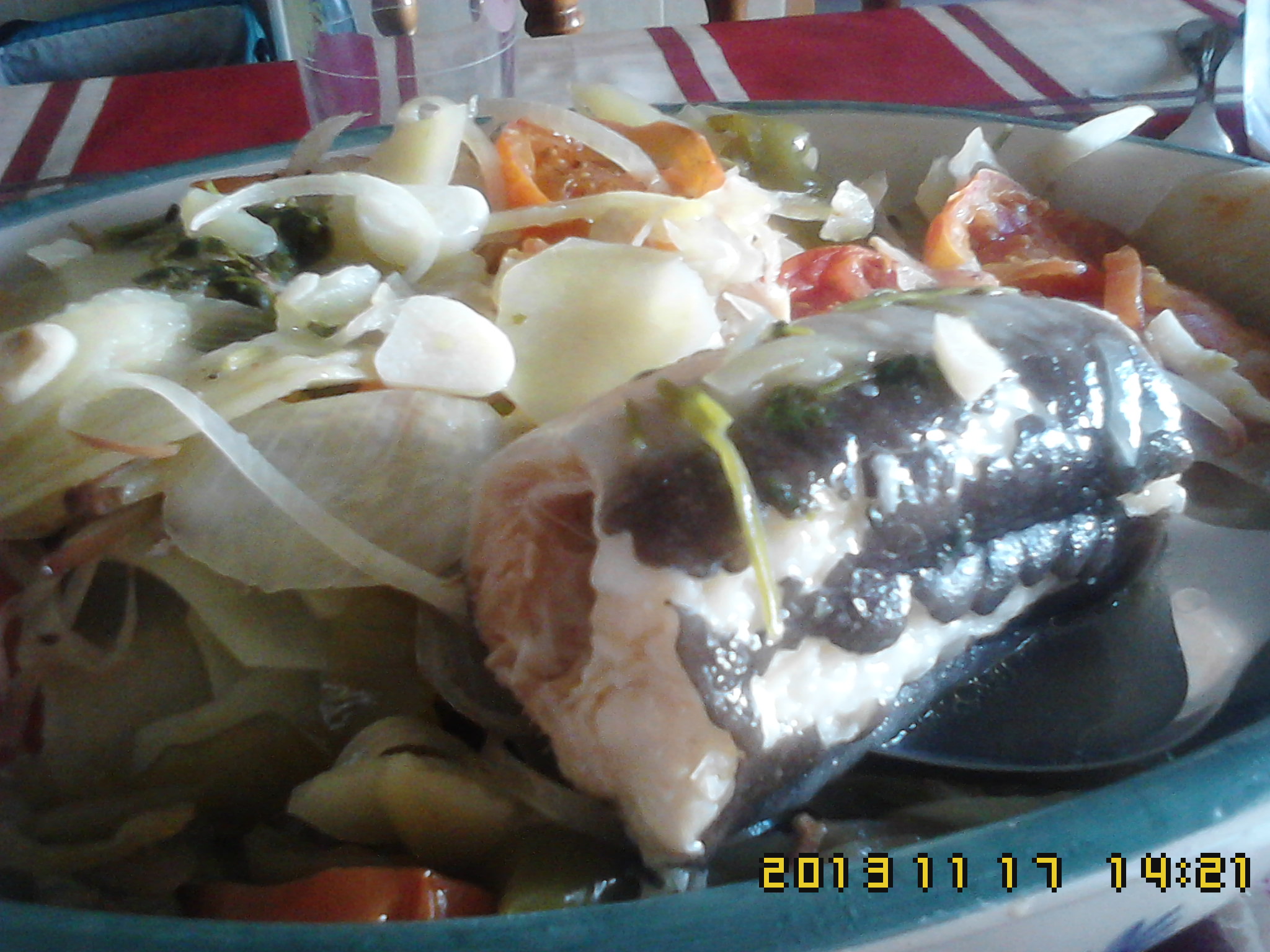 2) Coloque no copo a água, feche o copo. Coloque na varoma uma folha de loiro, uma camada de cebola, batata, peixe (perca,safio,línguado,carapáus), ponha sal por cima deles a seguir,os alhos cortados, cebola, batata ás rodelas finas, pimento, tomates, coêntros, malagueta pequena. Faça a segunda camada igual em cima do peixe.
