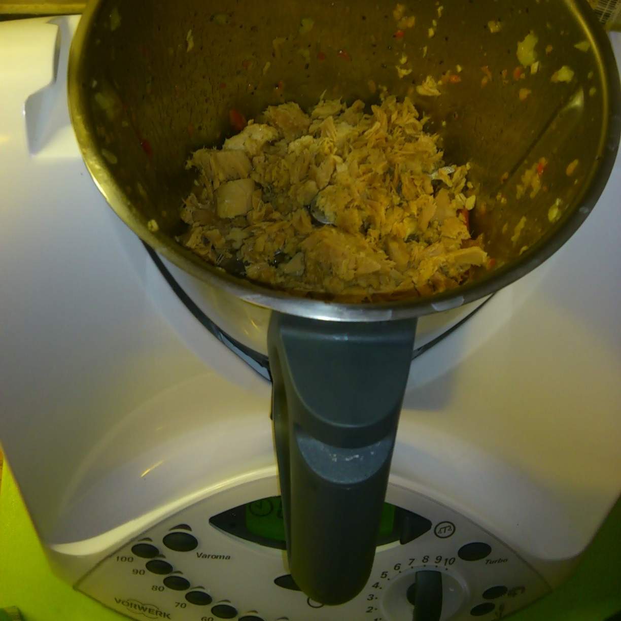 Junte a polpa de tomate o pimento e pique mais 5 seg. vel. 5. Junte o atum, as delícias do mar e o sal e programe 5 min /100º/