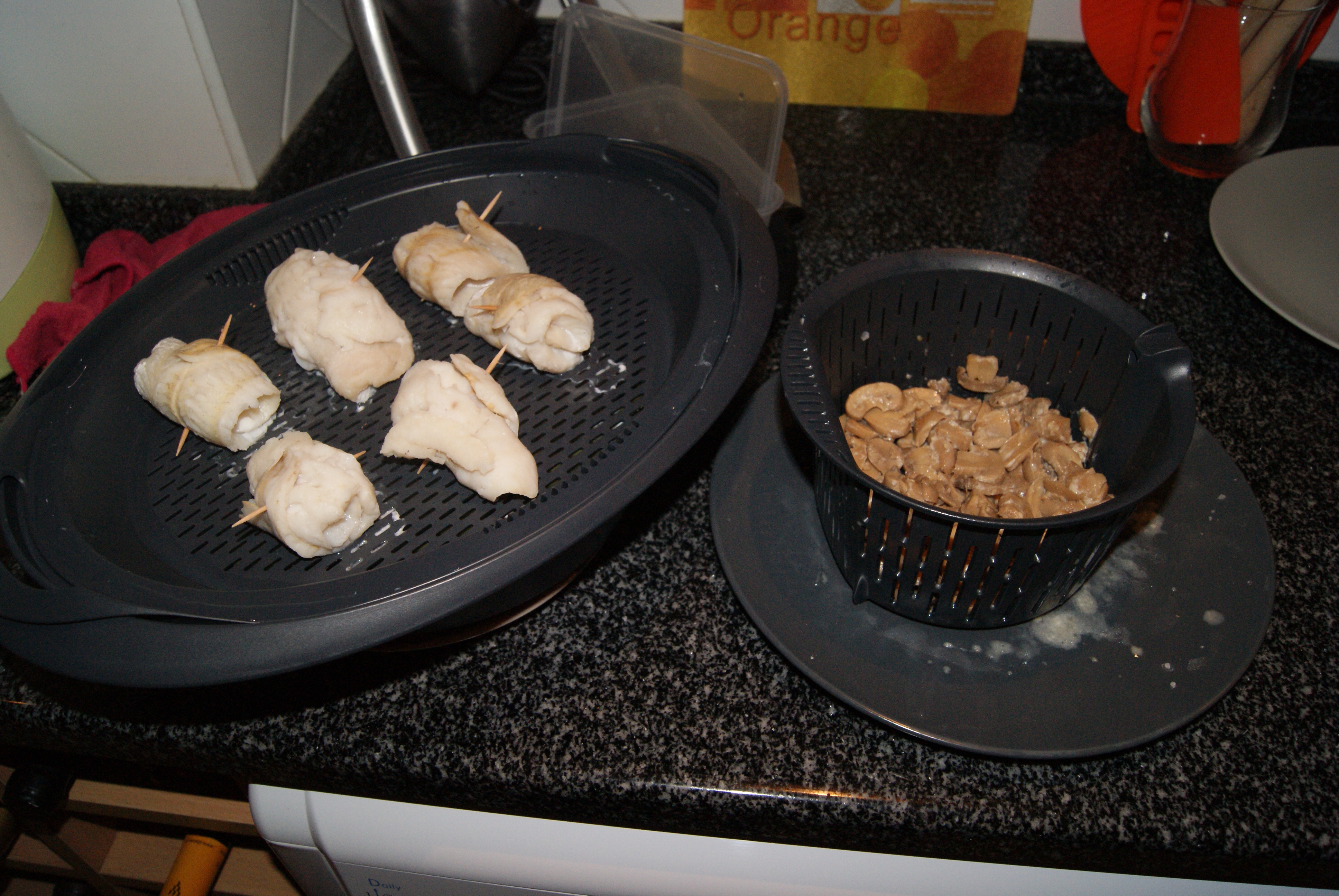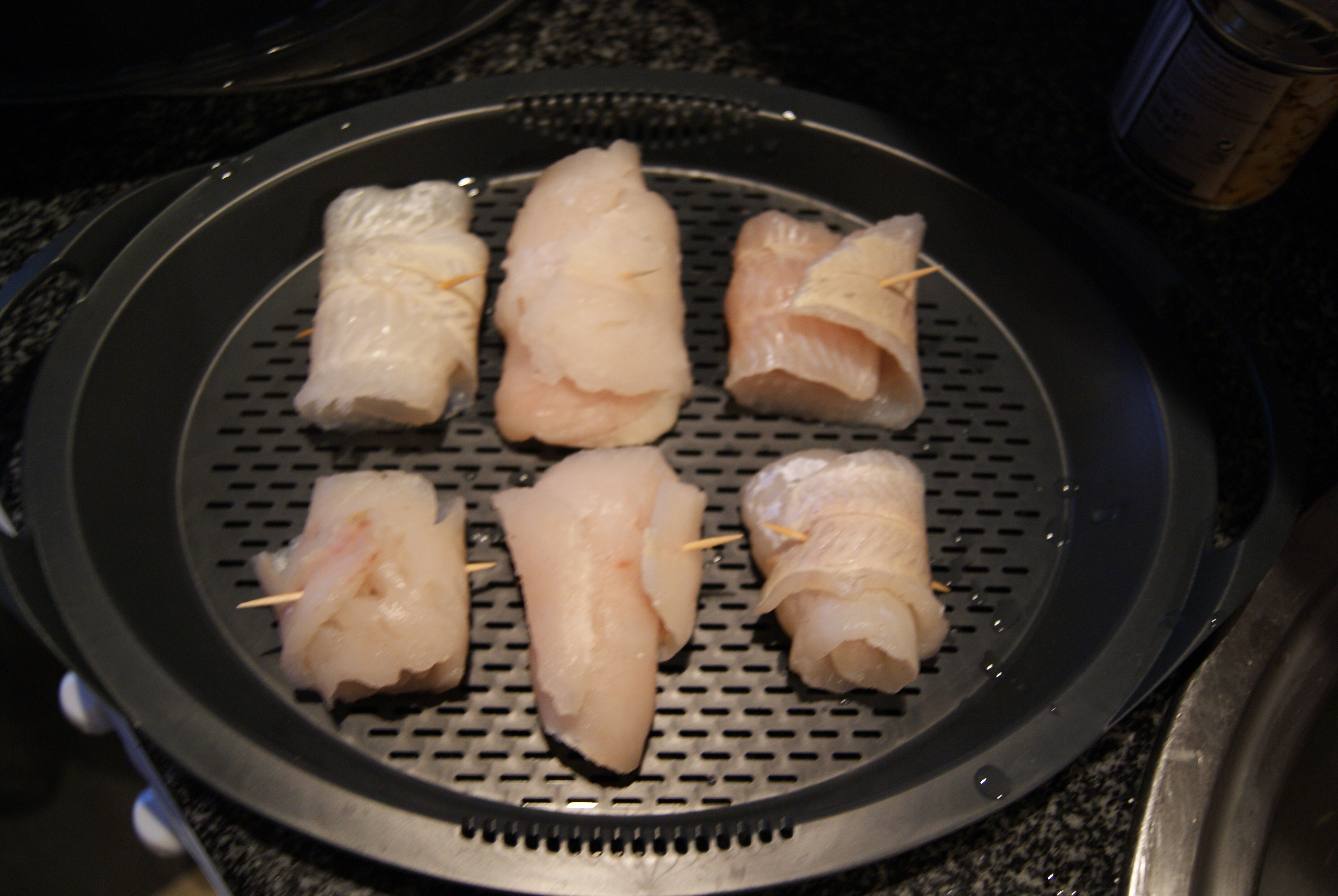 1. Tempere os filetes com sal e pimenta. Enrole cada filete e prenda com um palito. Coloque os rolos de peixe na Varoma e coloque os cogumelos no cesto. Reserve.