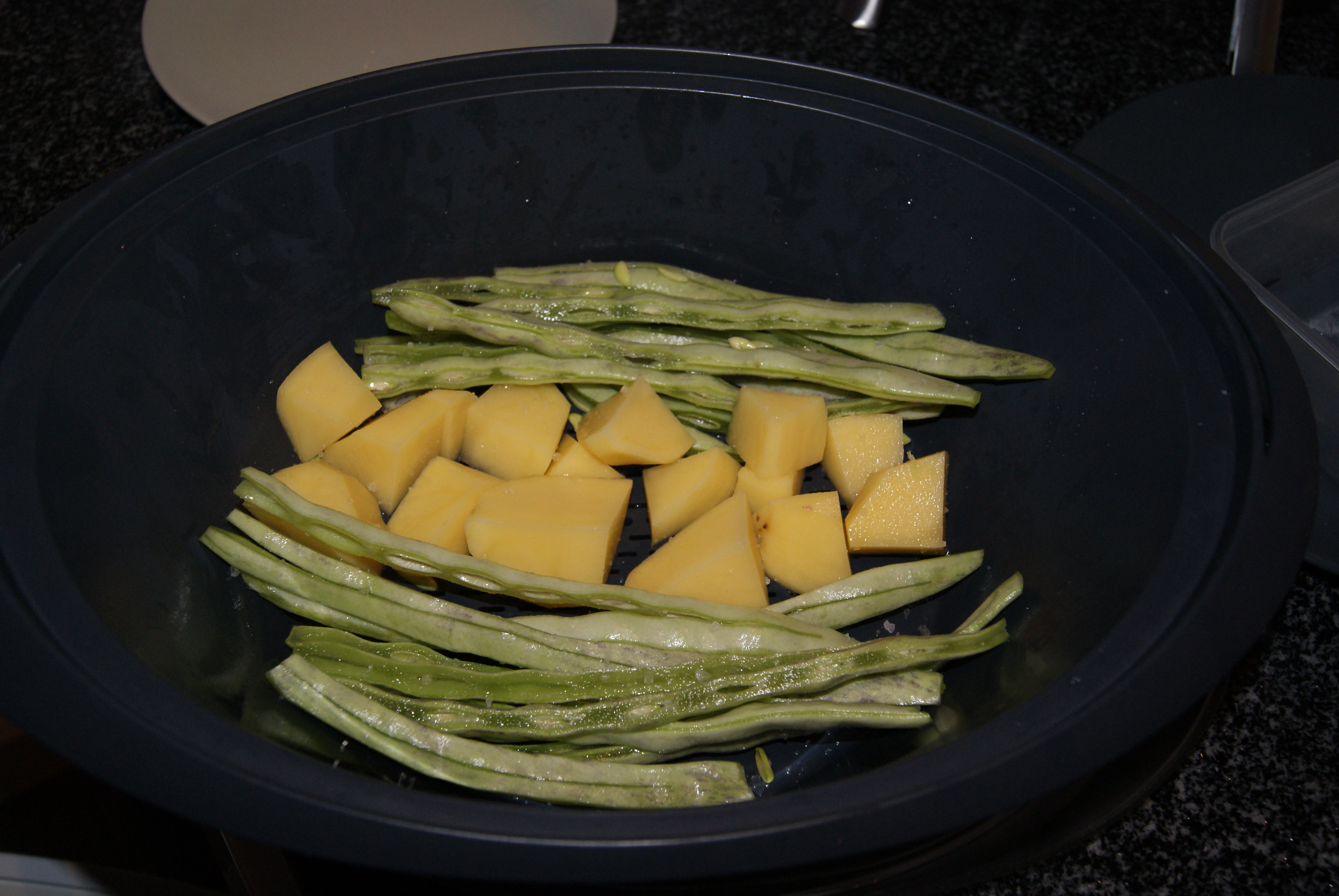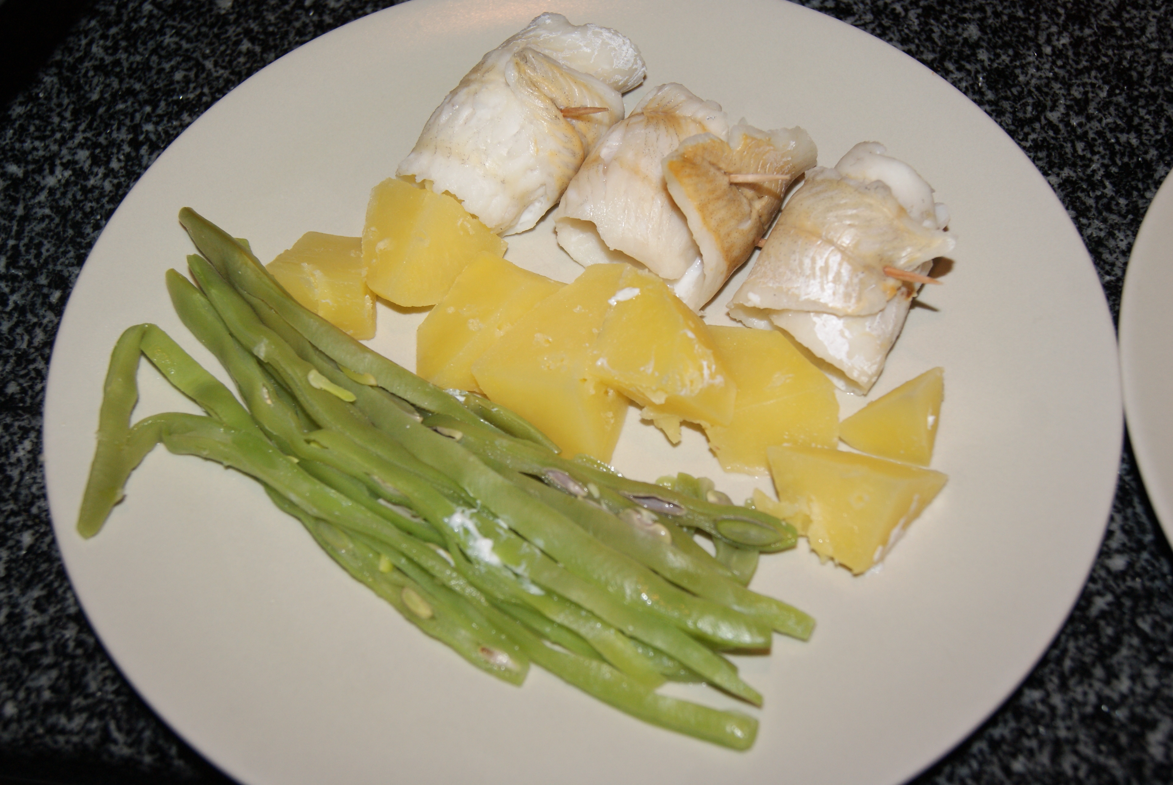 NOTA 1: Como acompanhei o peixe com batatas cozidas e feijão verde, coloquei o peixe no tabuleiro da varoma e as batatas e feijão por baixo.